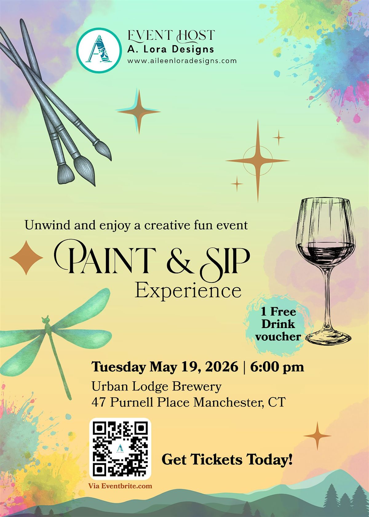 Relax unwind and let your creativity go wild setting the tone for a positive week! We will be painting as a group a mountain landscape sunset scenary with greenary, flowers and a firefly. Perfect theme for the spring! No experience necessary we welcome all levels. Join us on Tuesday May 19, 2026 at 6:00-8:15 PM (in-person) for a fun and creative gathering. Let your imagination run free in a creative and fun space. Sip, socialize and bring your curiouslity of trying something new or revisiting your creative side.