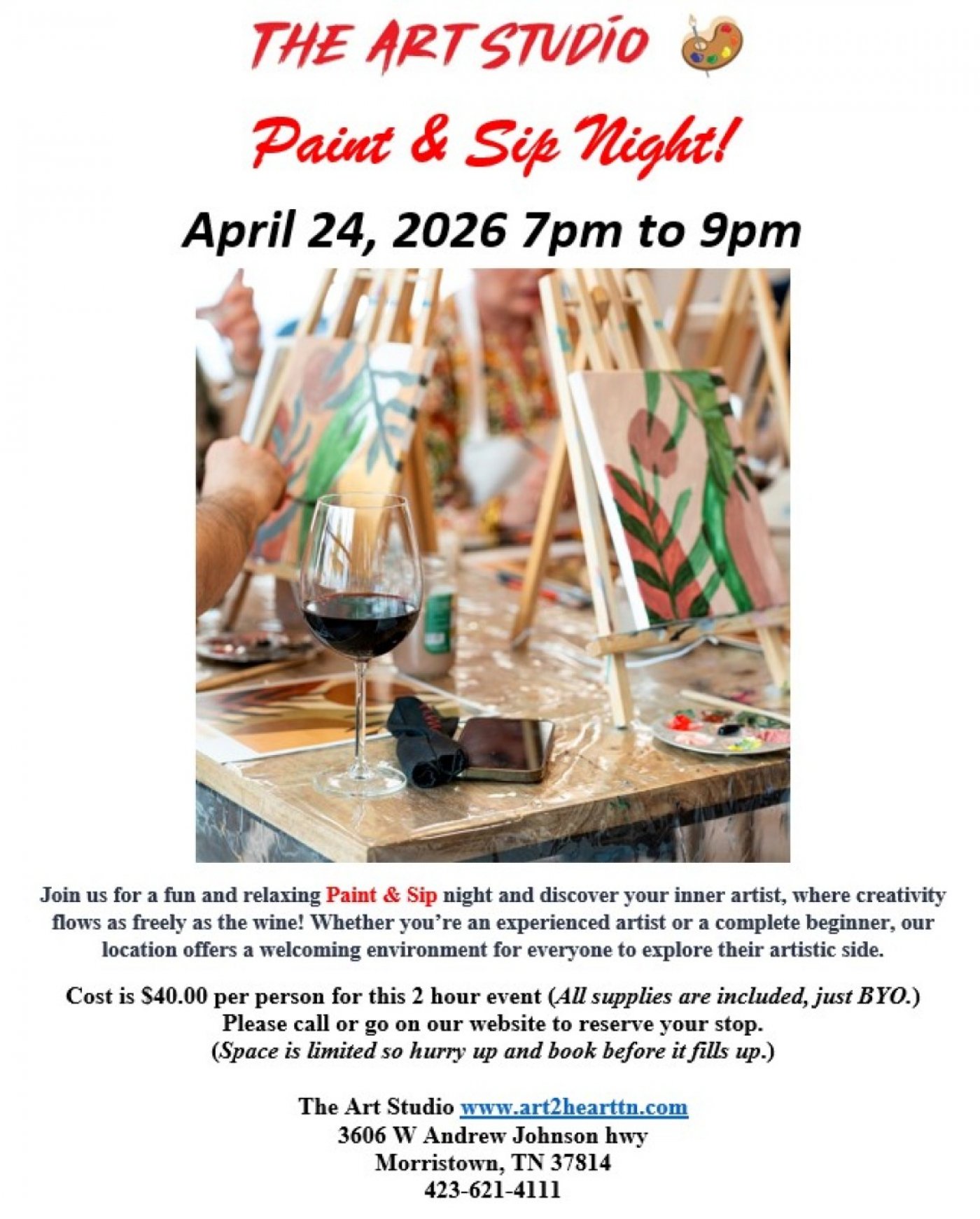 Cost is $40.00 per person for this 2 hour event (All supplies are included, just BYO.)