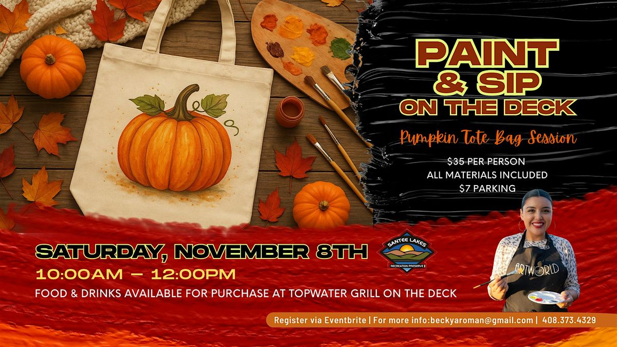Join us for a fun-filled Paint & Sip event on The Deck at Santee Lakes Recreation Preserve! In this step by step guided session, we will be painting adorable Pumpkin Tote Bags perfect for the fall season. Grab your friends and unleash your creativity while enjoying the beautiful outdoor setting. No experience is needed, just come ready to have a great time! Food & drinks available for purchase at Topwater Grill on the deck. Book your spot now!