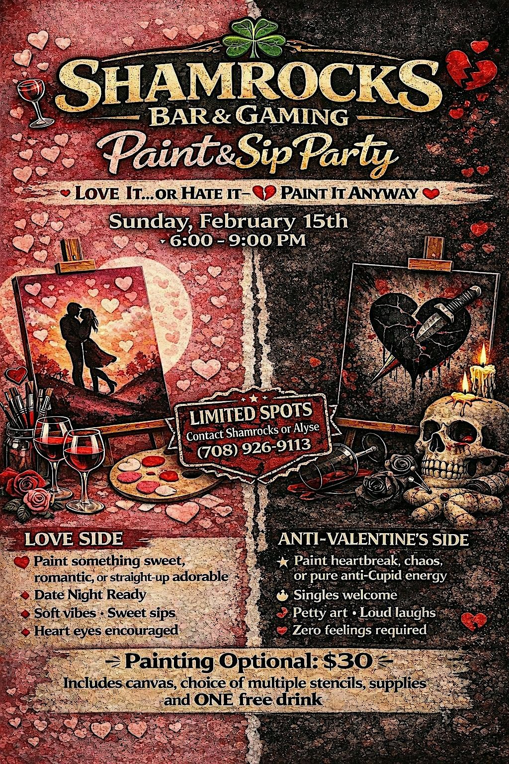 Get ready for a fun night out where you can unleash your creativity and enjoy some great drinks and food. Whether you're a lover or a anti-valentines day kinda person this event is for YOU! Try something new, this in-person event is the perfect chance to relax, sip your favorite drink, and create your own masterpiece. No pressure, just good vibes and colorful canvases. Grab your friends and let's make it a night to remember!