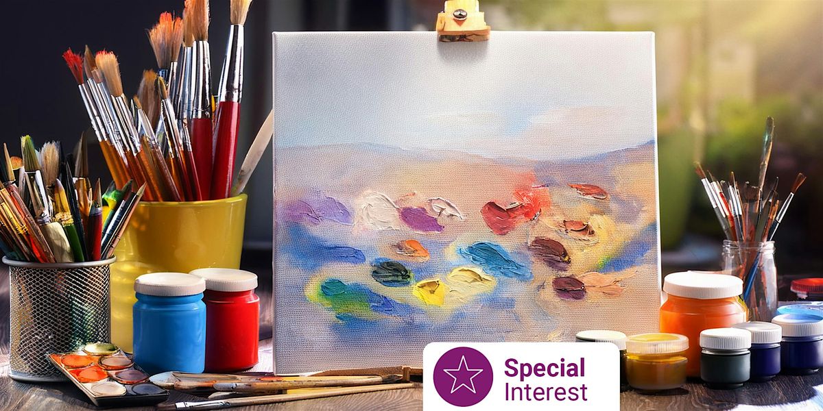 [ Image description: A table covered with containers of paint, jars of paint brushes, and a canvas with a colourful abstract painting. Text reads, special interest ]