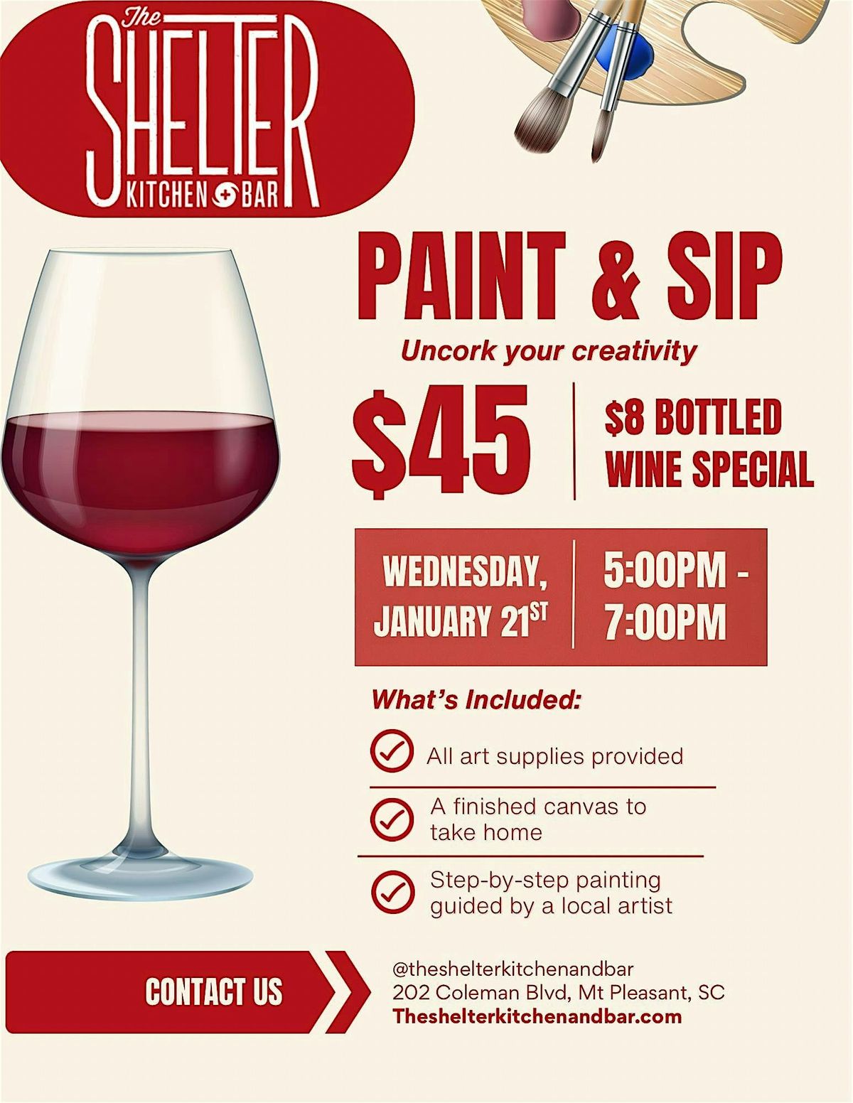 Join us for a fun in-person evening where you can unleash your inner artist! Sip your favorite drink, relax, and let your creativity flow as you paint along with our friendly instructor. Whether you're a pro or just starting out, this event is all about having a blast and making beautiful art. Bring your friends, bring your smiles, and get ready for a night of colorful fun!