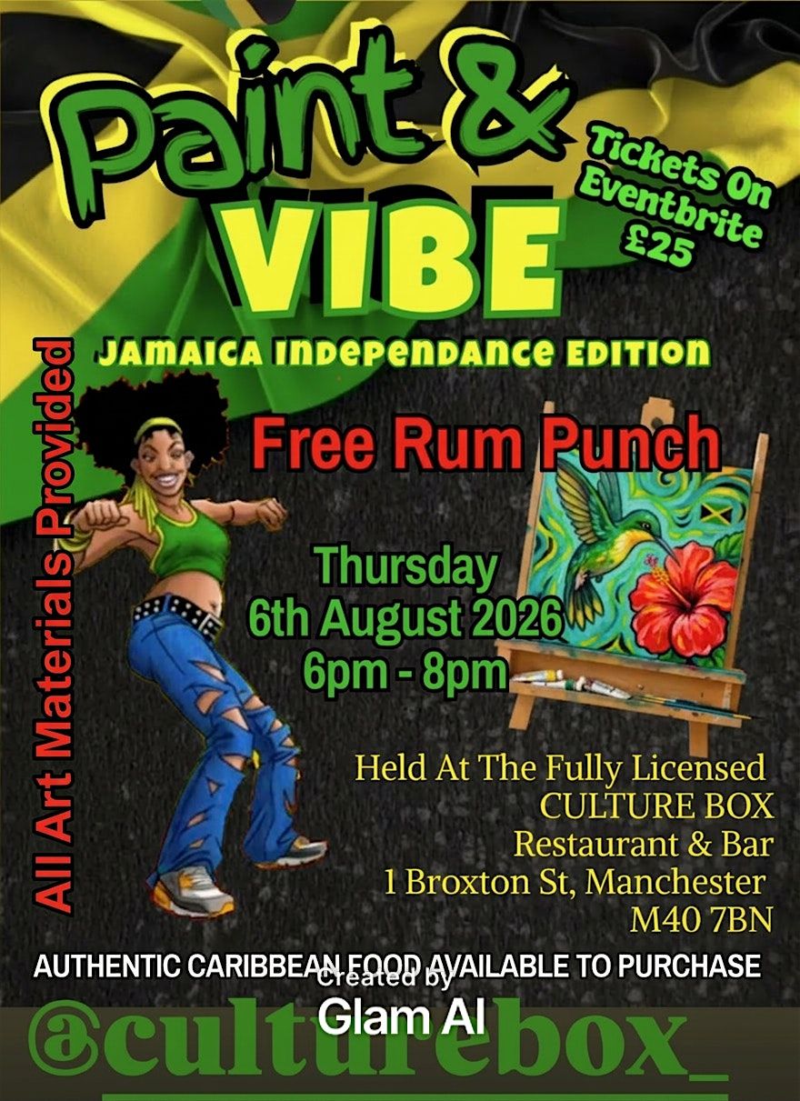 Get ready to paint, vibe, and celebrate Jamaican independence in style! Join us at Culture Box on August 6, 2026 at 6:00 PM (BST) for a chill evening filled with creativity, good music, and great company. Whether you’re an art pro or just here for the vibes, this event is all about fun and culture. Don’t miss out on this colorful night – bring your friends, enjoy the complimentary rum punch and let’s make some memories, Culture Box nibbles will be available to purchase, the sweet chilli wings are highly recommended and be sure to visit the fully licensed bar.