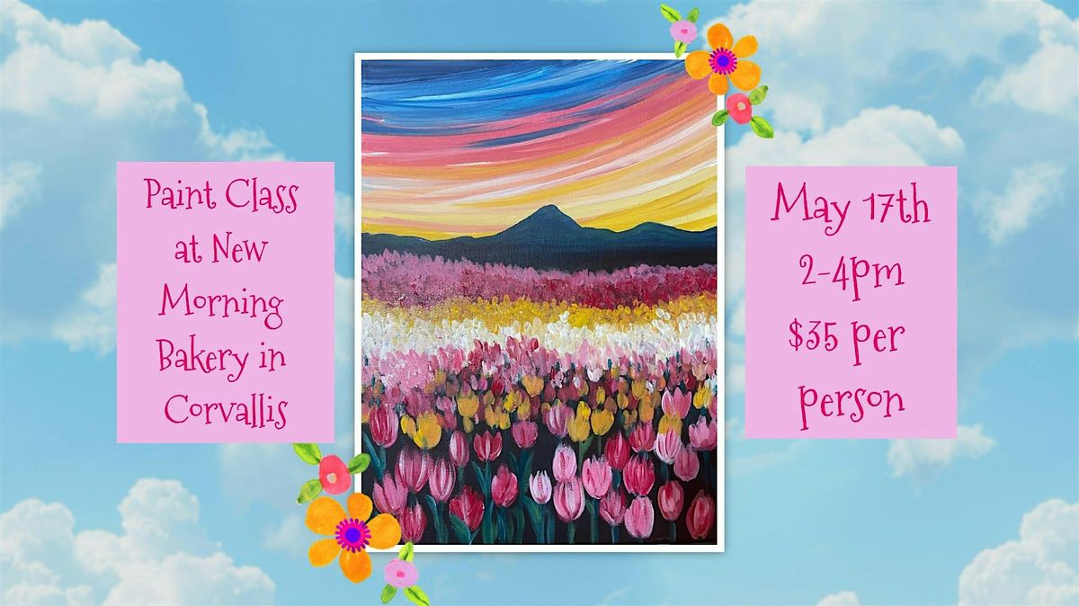 New Morning Bakery is centered in the heart of downtown Corvallis, offering more than coffee and cake. This lovely cafe has a cozy-homey atmosphere that will bring you to the present moment, as you indulge in house-made lasagna, fresh salad, and all of the baked goodies you can imagine. There is also a 75ft wall displaying a handpicked artist's work that rotates each month - what better place to paint this beautiful field of tulips?