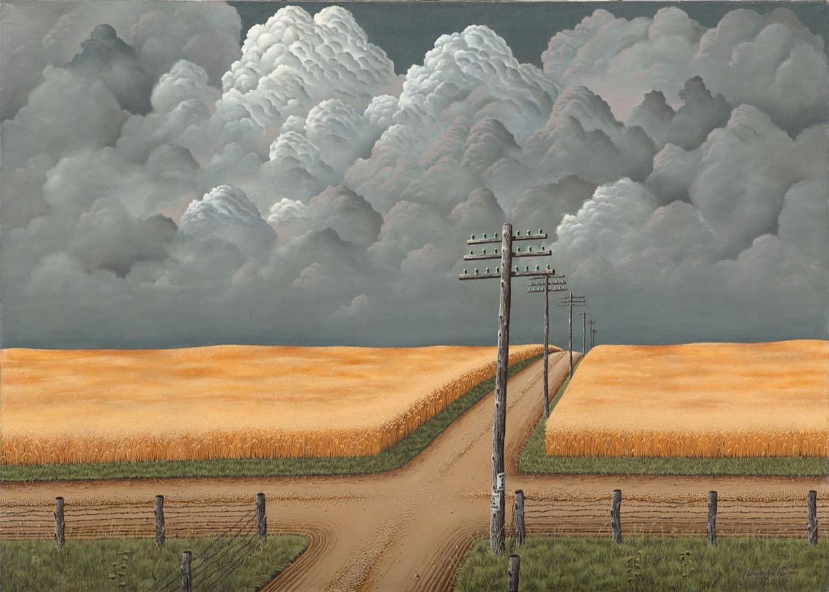Cox painted Gray and Gold shortly after the United States joined the Second World War, and its image of amber waves of grain threatened by ominous storm clouds likely has symbolic overtones. The painting's foreground features an intersection of two dirt lanes, as well as a telephone pole emblazoned with political campaign posters. The artist seems to imply that American democracy is at a crossroads during this time of combat against the spread of fascism in Europe and Asia. Interestingly, the work was inspired by the landscape around Cox's hometown of Terre Haute, Indiana, a location nicknamed "The Crossroads of America" due to the junction of major north-south and east-west national highways within its city limits. The museum purchased this painting out of a traveling exhibition entitled "Artists for Victory," which consisted of works by artists who wanted to assist in the war effort. The exhibition opened at the Metropolitan Museum of Art in New York on the first anniversary of the bombing at Pearl Harbor.