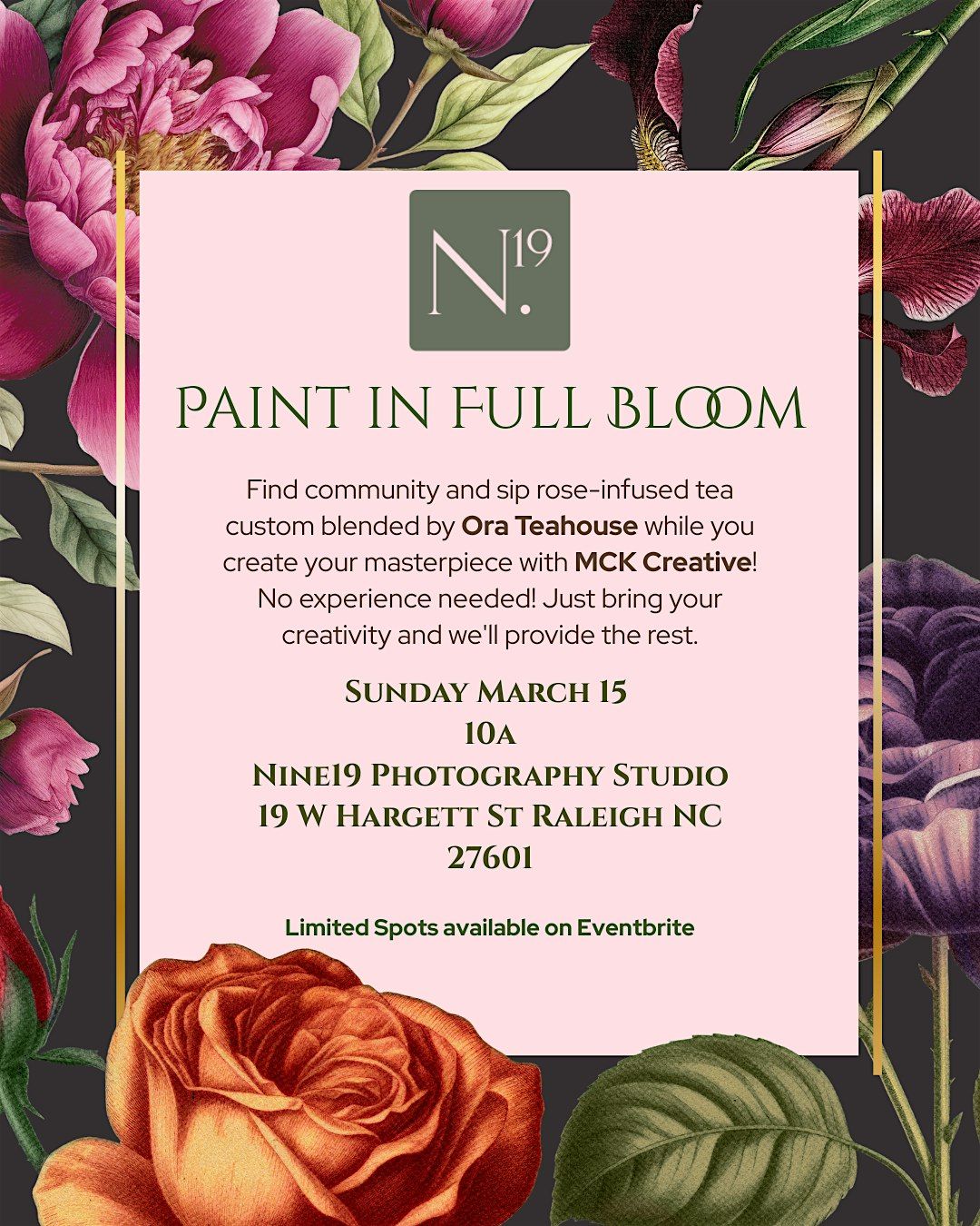 Join us for an relaxing morning where art meets tranquility with community at Nine19 Photography Studio! Paint in Full Bloom is a unique twist on the traditional paint and sip experience. We decided to swap the all wine selections for beautifully and intentionally brewed rose-infused tea curated by Ora Teahouse as you unleash your inner artist with teaching by MCK Creative.