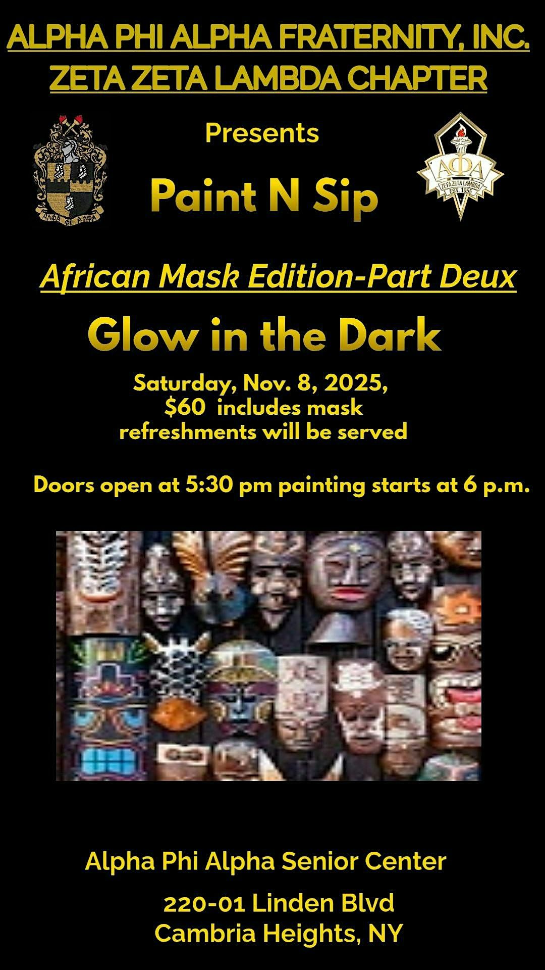 You can see the wonderful creations of our last African masks creations in the photos above. Come join us for another fun-filled evening of painting African Masks and sipping at Alpha Phi Alpha Senior Citizens Center! This time we are making the masks glow in the dark. So come and let your creativity flow as you paint your own unique African mask masterpiece. No experience necessary - our talented instructors will guide you every step of the way. Grab your friends and unleash your inner artist at this exciting event!