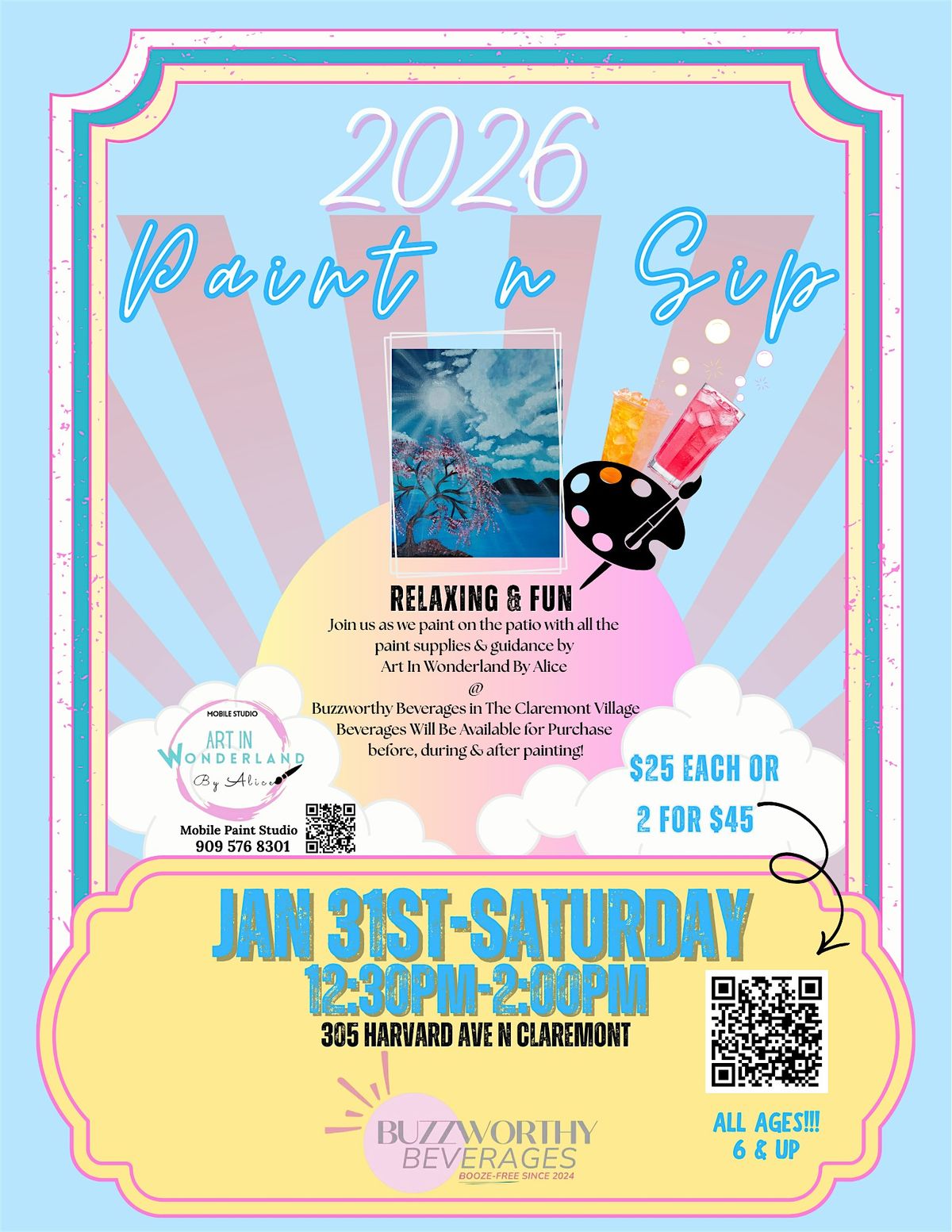 Get ready for a fun & casual DAY where creativity flows as freely as the drinks! Join us at BUZZWORTHY BEVERAGES in the heart of The Calremont Village for an afternoon of painting, sipping on the best non alcholic beverages, and good vibes! Take the chance & unleash your inner artist while enjoying some tasty beverages. Come, see, taste and feel what everyone is talking about!