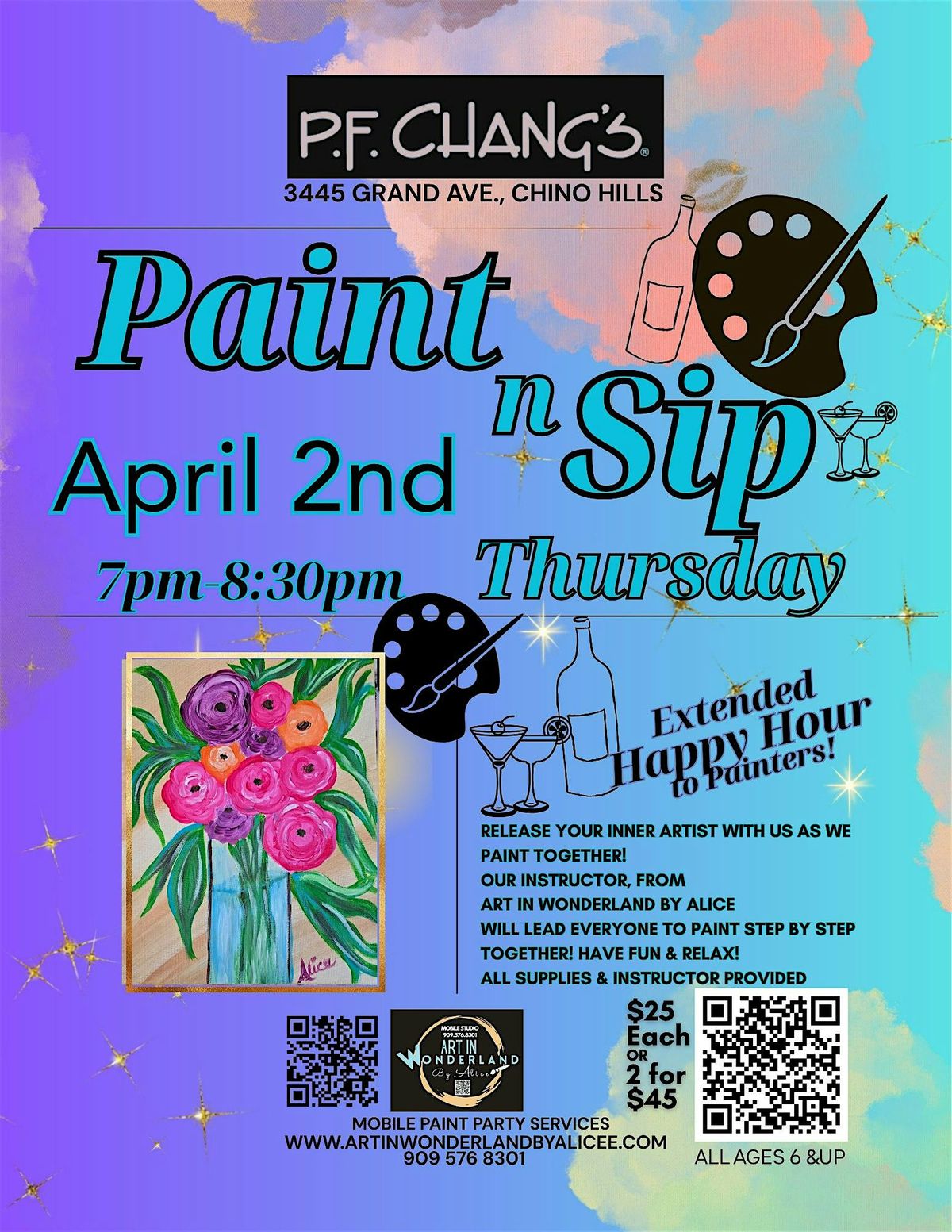 Looking for a fun yet relaxing night out? Come paint and sip at PF Changs Chino Hills, (at The Shoppes) This event is all about creativity, laughs, relaxation and tasty drinks, if you will! Spring is in the air and it is time to "Bloom"! Alice from Art In Wonderland By Alice will lead everyone to paint step b step together in person. By the end of our session, U will have a blooming ๐ธ๐painting on canvas to take! All paint supplies provided for use with live instruction by Alice๐๏ธ๐จ. Just bring you and maybe a friend or two. Remember you do not need a partner to paint.๐๐ท๐๏ธ๐จ๐โ