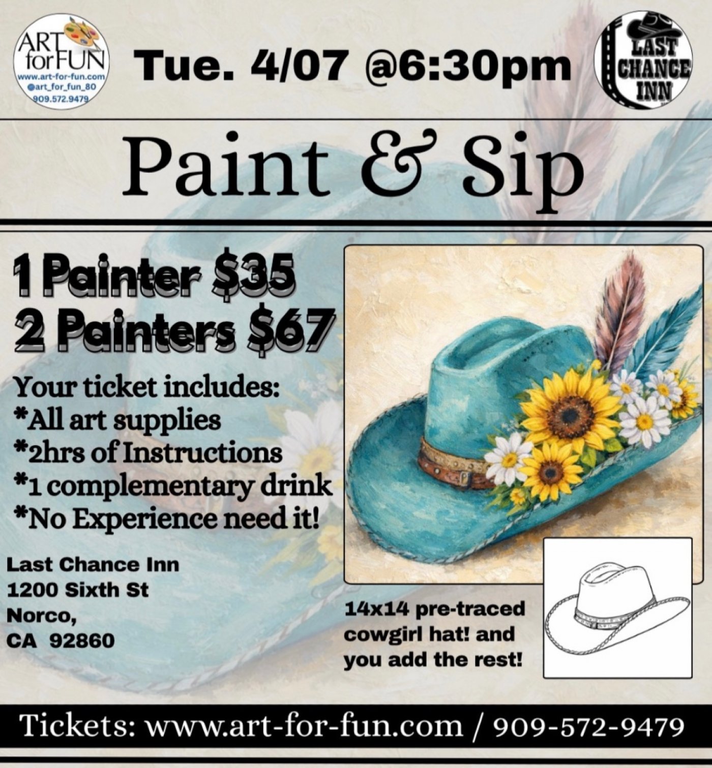 Paint, sip, and unwind! Step into a colorful evening filled with art, drinks, and feel-good energy. No experience needed—just bring your creativity to this 2-hour guided paint class designed for all skill levels and perfect for making memories with friends and family.