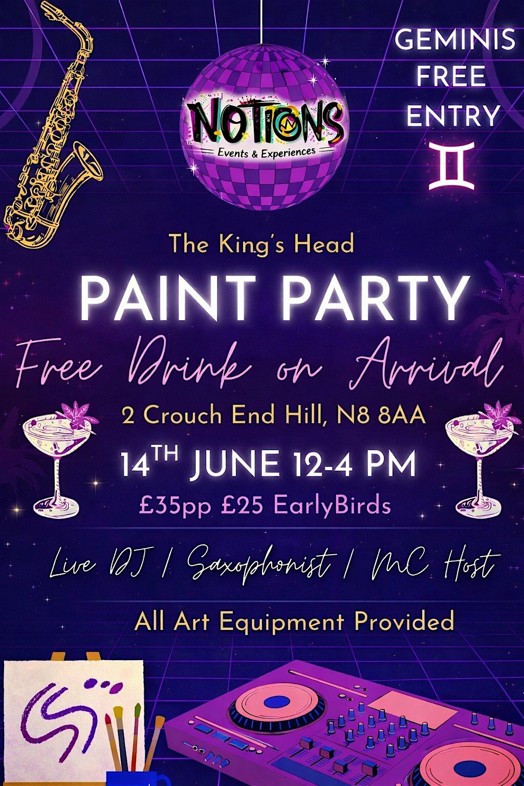 Get ready for an afternoon of painting, music and party vibes at The Kings Head isn’t your typical paint class – expect a live DJ, musician great atmosphere and plenty of energy while you create your own artwork.