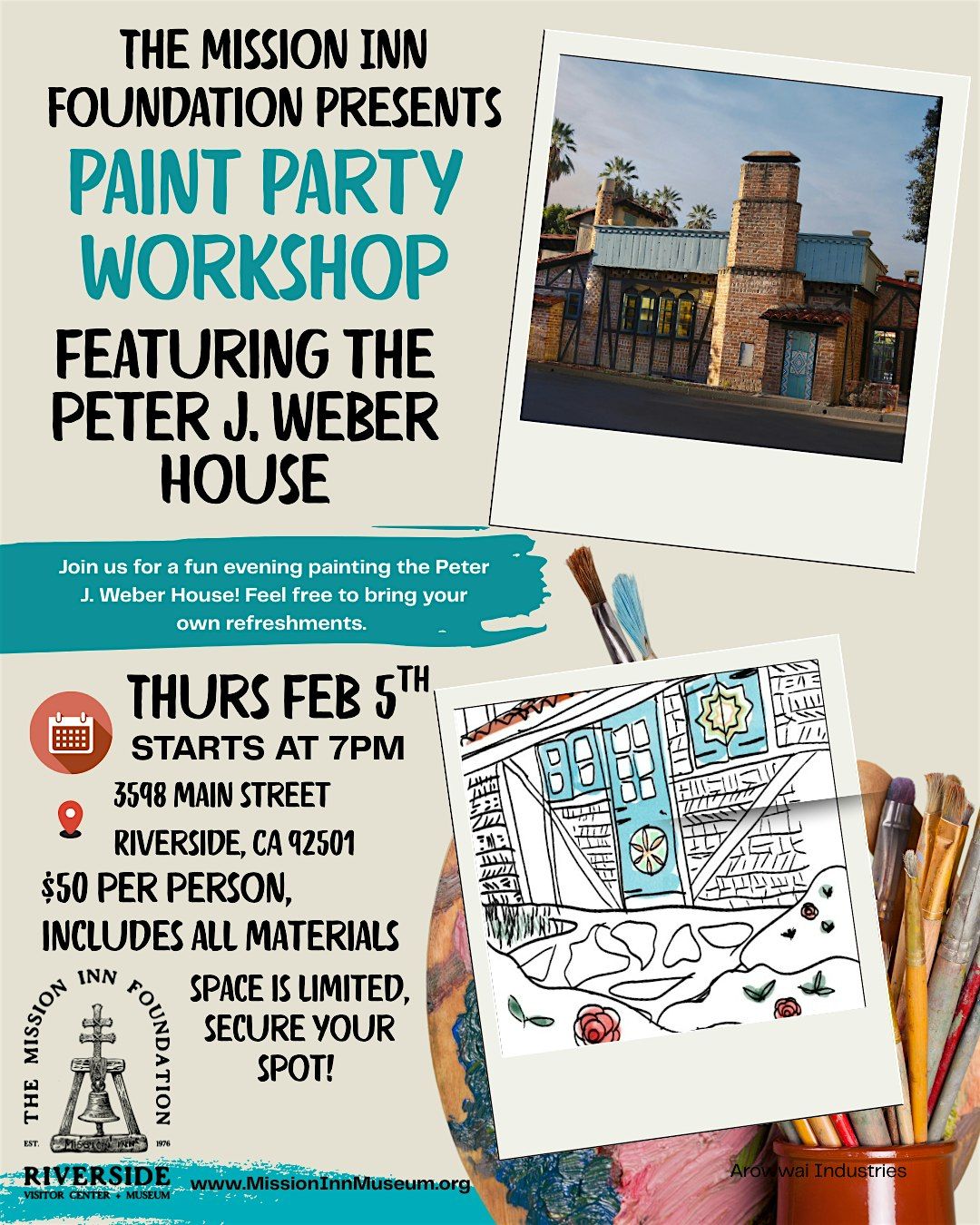 Here's your chance to create a painting of Riverside's historic Peter J. Weber House. The price includes all materials. Feel free to bring your own refreshments.