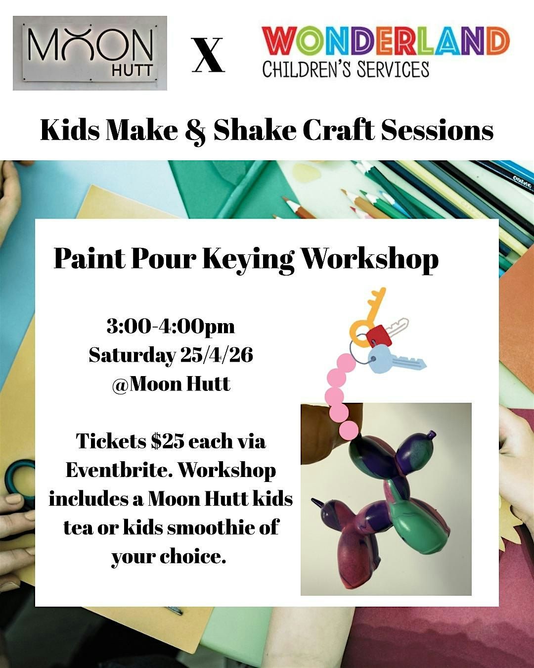 Each ticket includes a kids size Moon Hutt tea or smoothie and the materials to make a paint pour keyring.