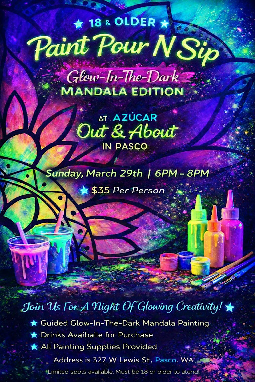 Join us for an 18+ Mandala Glow in the Dark Paint Pour N Sip on Sunday, March 29th from 6:00PM – 8:00PM at Azúcar Out and About!