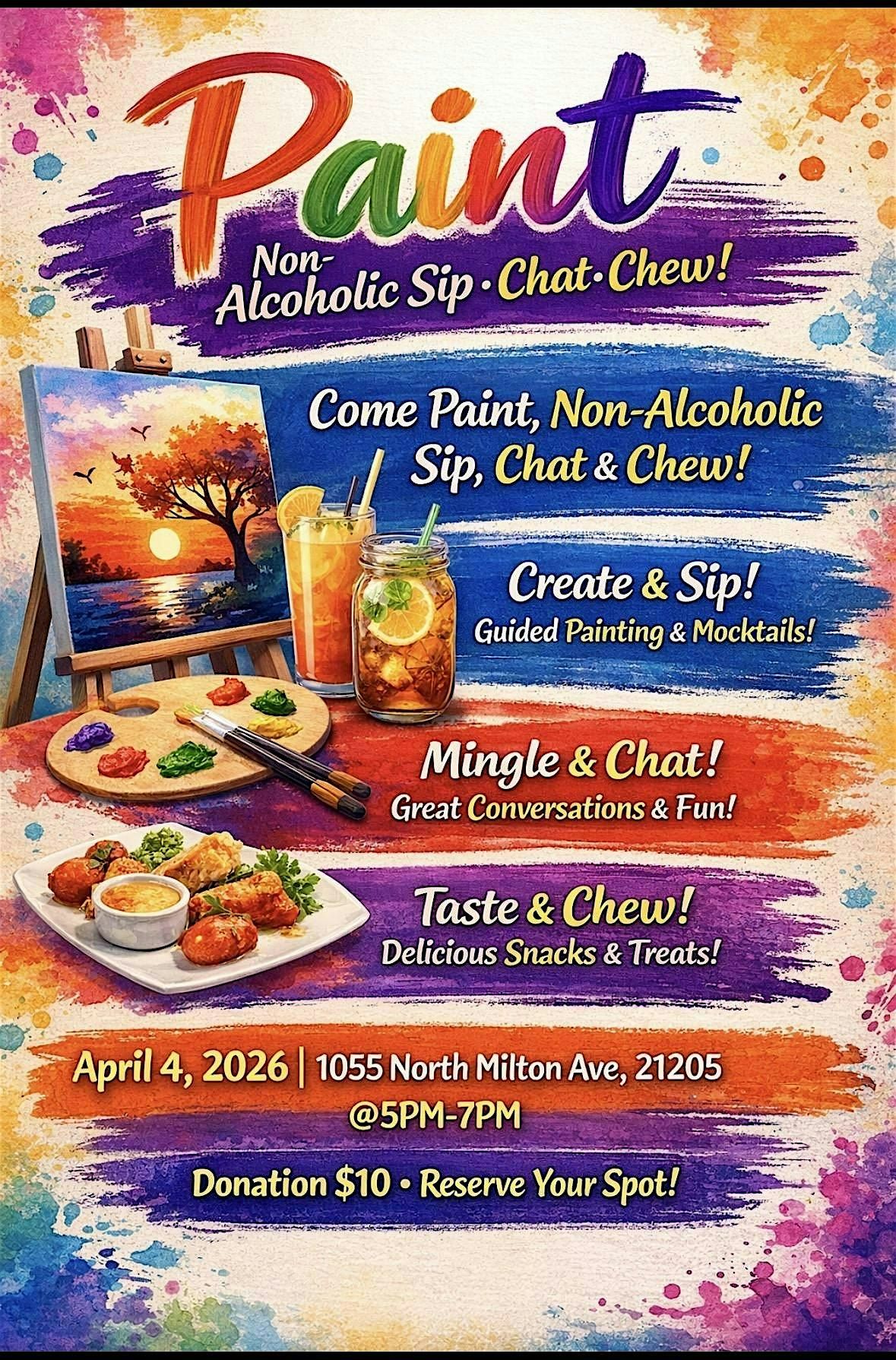 Get ready for a fun in-person gathering where you can unleash your creativity, enjoy great conversations, and savor some tasty bites. Whether you're a painting pro or just looking to try something new, this event is all about good vibes and good company. Bring your friends or make new ones while you paint, sip, chat, and chew the day away!