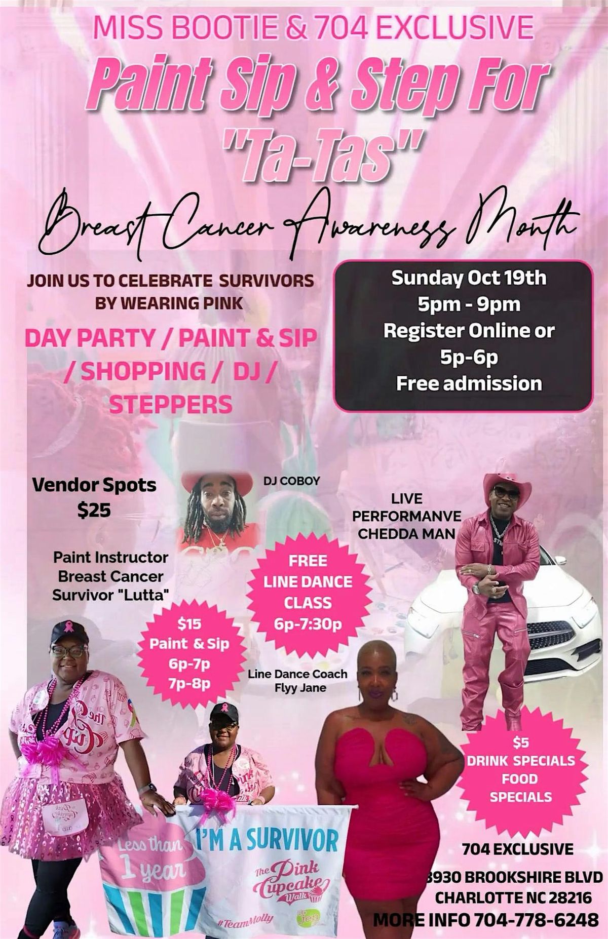 Pink Day Party for Breast Cancer Awareness Month Sunday Oct 19th 5p-9p at 704 Exclusive! Free Admission... Everyone is invited. Sip and Paint Instructor - Breast Cancer Survivor Corelutta Reid , Beginners Line Dance Class w/Flyy Jane, Performance by Chedda Man & music by DJ Cowboy with the Southern Soul hits. Also enjoy the NFL Watch Party & Food 1p-10p with James Foye and Kent Snap. Vendors inbox or text 704-778-6248. Come out to "Paint, Sip, Shop & Step for Ta-tas!" Wear pink to celebrate survivors.