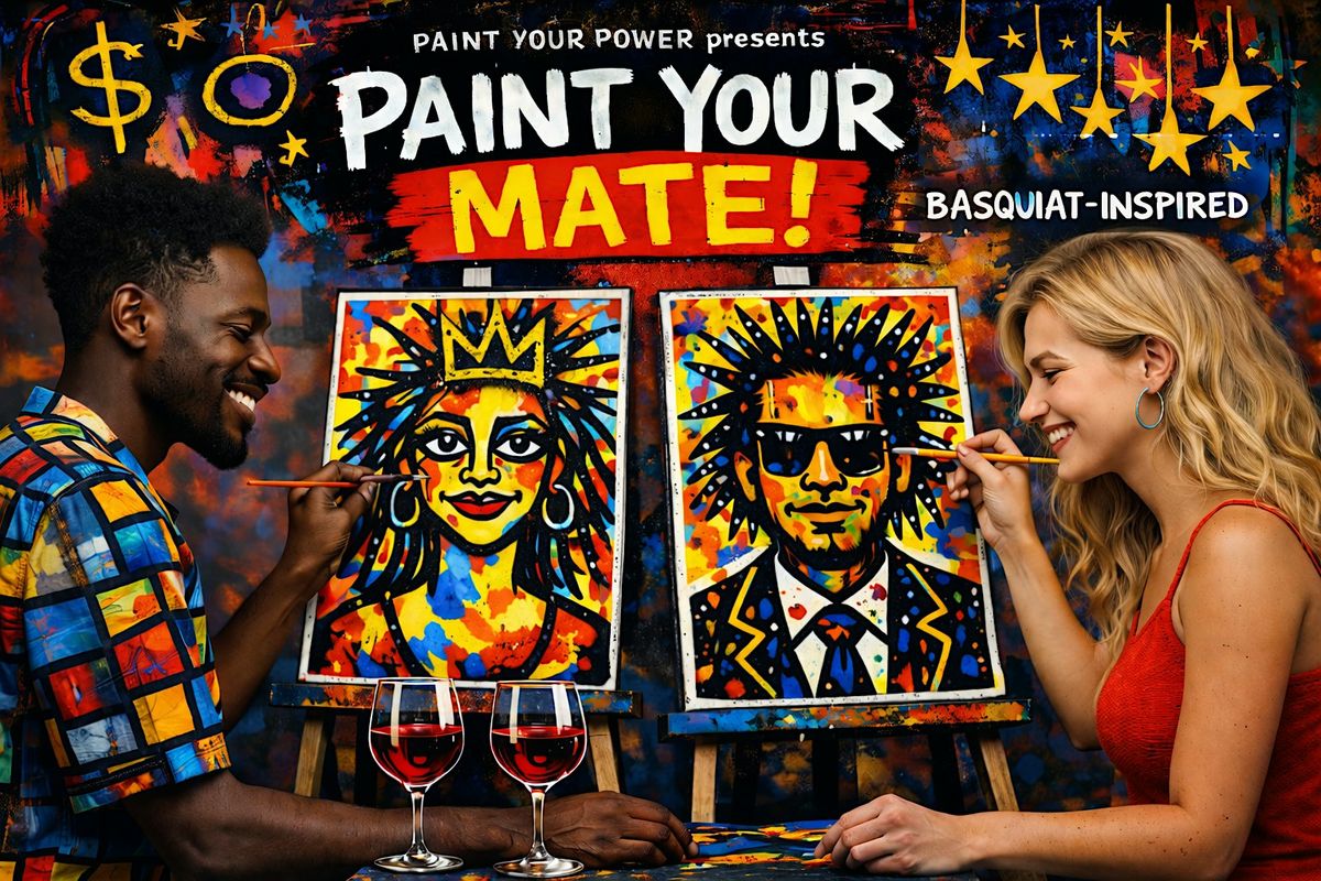 At Paint Your Mate: Basquiat Style, couples will create abstract, graffiti-inspired portraits of each other using bright colors, symbols, crowns, words, and expressive lines. No realism. No pressure. Just pure creative energy.