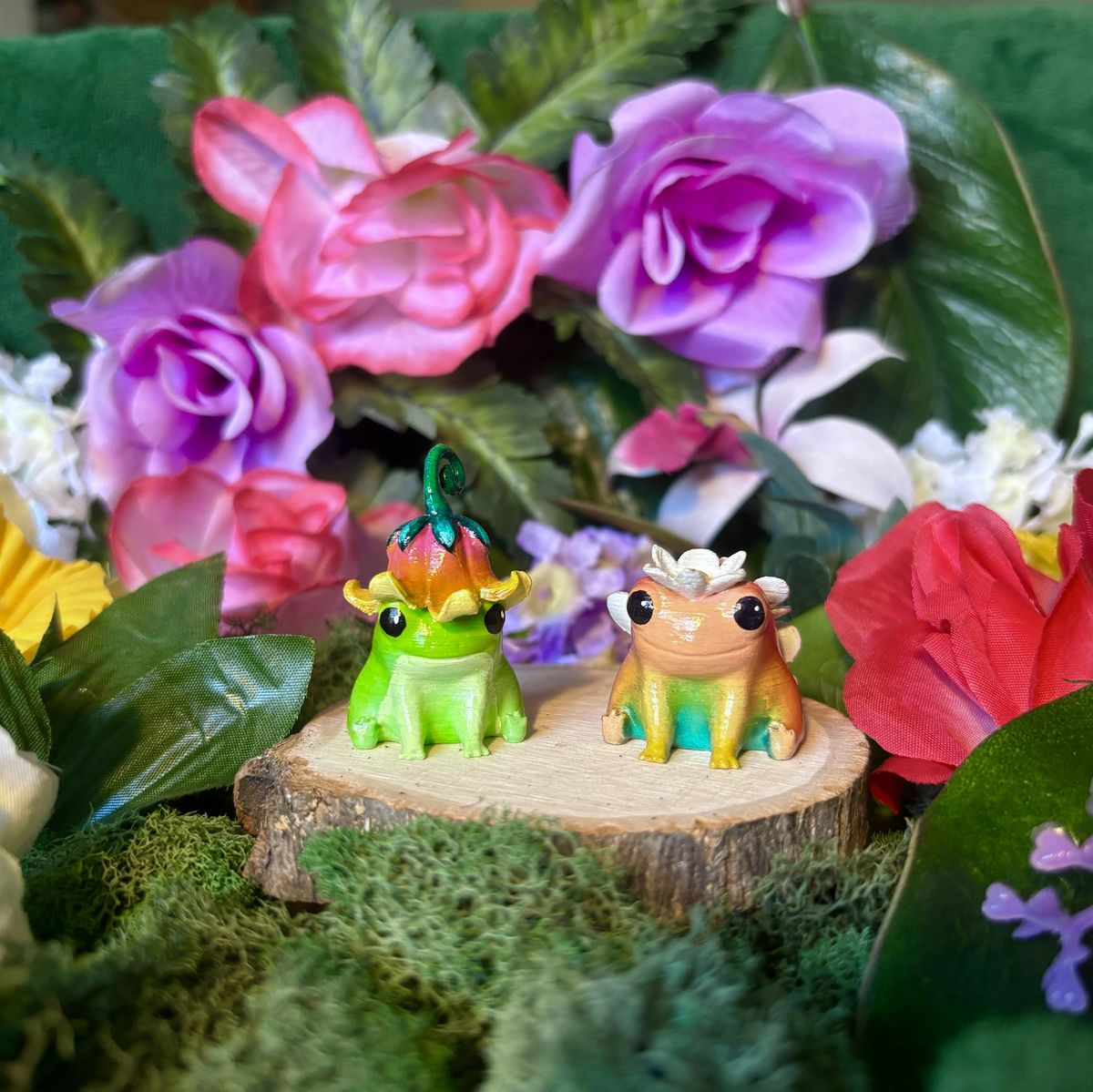 All frogs are 3D printed and I will have a variety of different colors for you to choose from. Frogs are approximately 1.5 inches in size. There are four Five Frog designs: the Flower Hat Frog, the Daisy Frog, the Four-Flower Frog, the Sunflower Frog, and the Flower Throne Frog. Class participants can choose any two frogs (per person) to paint. Extra frogs may be purchased during the event for an additional $5 per frog. Sign up to paint your flowery friends today!