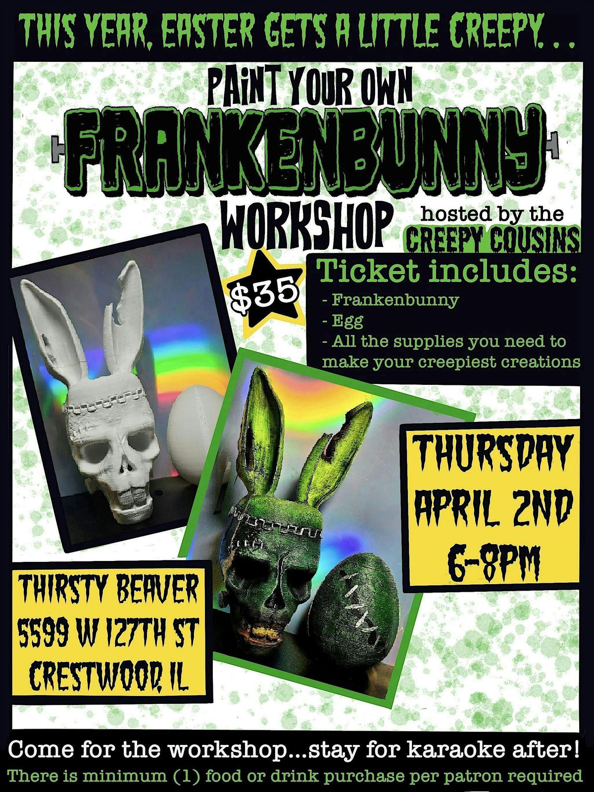 This year, Easter gets a makeover at Thirsty Beaver! Join us on April 2, 2026 from 6-8 at 5599 W 127th St in Crestwood. No experience necessary, just your spookiest vibes and your imagination! Ticket includes a Frankenbunny figure, Easter egg, and all the supplies to make the creepiest creations that will make even the darkest of hearts happy. Come play with us.