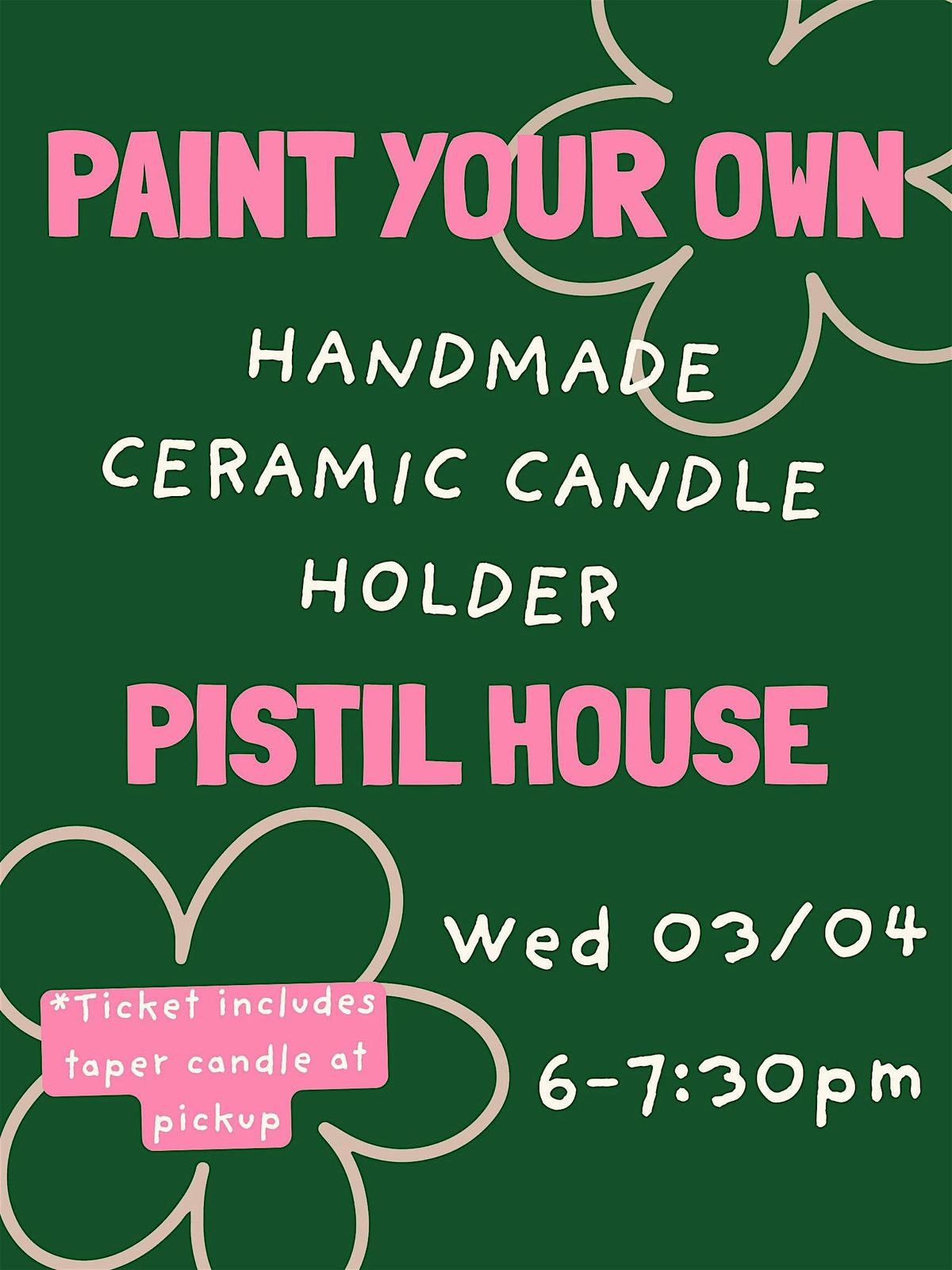 Join us for a fun and cozy workshop painting your own handmade ceramic candle holder, guided by Hannah Lawson from Hans.Pots! Bring your creativity, grab a drink from Pistil House, and make new friends while creating a unique piece to light up your space. You will learn application techniques and hand-paint your candle holder with real ceramic glazes. Hannah will take your piece to be fired in the kiln and they will be ready for pickup in about a week. This ticket includes a tapered candle at pickup, so you are ready to use your candle holder as soon as you get home! Open to all skill levels, no experience needed :)