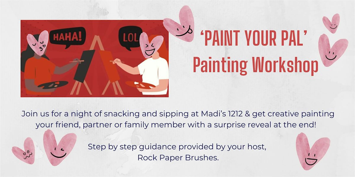 Join us for a night of snacking and sipping while we create a fun, whimsical work of art based on the face of your table mate! Big reveal encouraged! Your host, Christy from Rock Paper Brushes will lead you through creating your portrait step by step.