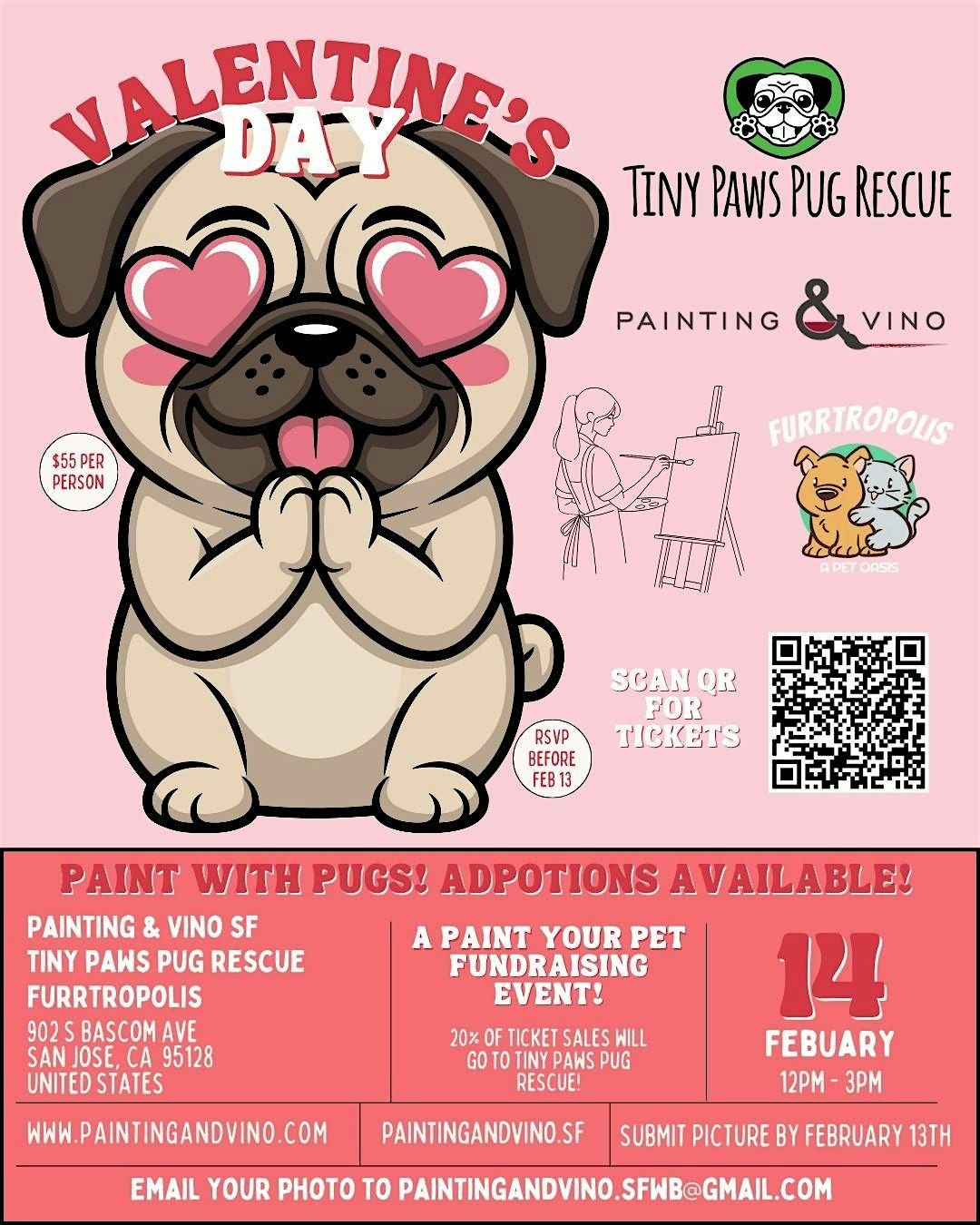 Join us in person for a fun and creative night where you get to paint your beloved pet alongside fellow pug lovers! Sip your favorite drinks, unleash your artistic side, and support a fantastic cause. Perfect way to celebrate Valentine's Day with furry vibes and good company. Don't miss out on this paws-itively amazing event!