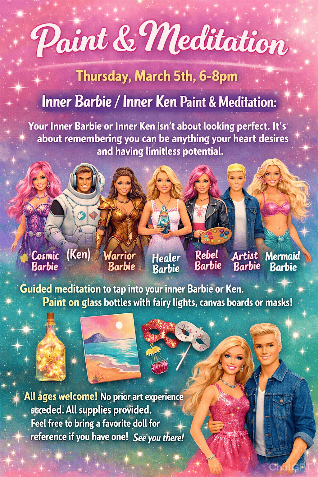 Your Inner Barbie or Inner Ken isn’t about looking perfect. It’s about remembering you can be anything your heart desires and having limitless potential. Whether you feel like you’re a Cosmic Barbie, (insert Ken) Warrior Barbie, Healer Barbie, Rebel Barbie, Artist Barbie, Mermaid Barbie or any kind you tap into, it’s a reminder of your core essence and being playful in your life. Guided meditation to tap into your inner Barbie or Ken. Paint on glass bottles with fairy lights, canvas boards or masks! All ages welcome. No prior art experience needed. All supplies provided. Feel free to bring a favorite doll for reference if you have one! See you there!
