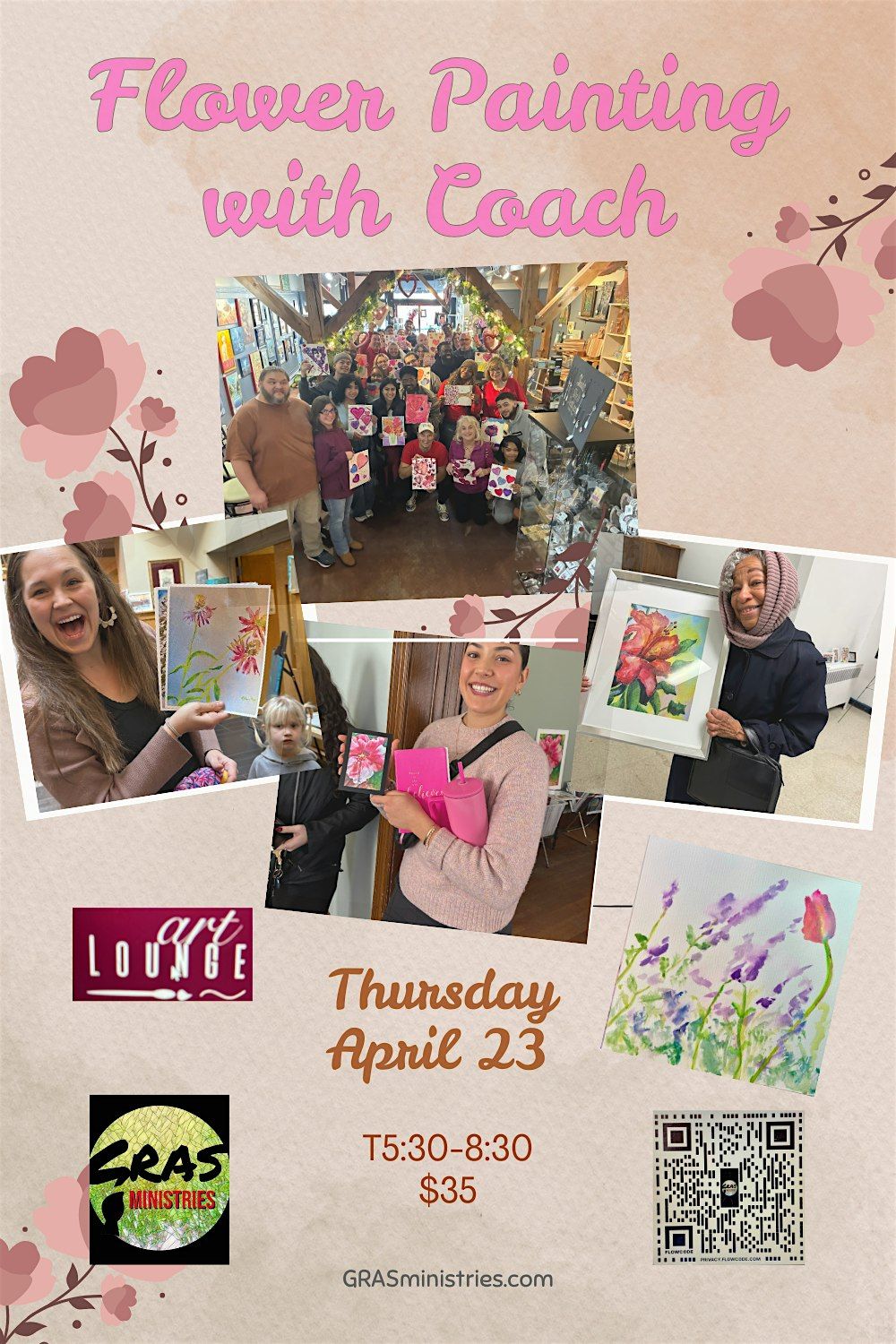 Join us for a fun and colorful in-person event where you'll learn to paint beautiful flowers step-by-step. Whether you're a beginner or just looking to unwind, our friendly coach will guide you through the process. Bring your creativity and get ready for a relaxing time filled with brushes, colors, and lots of blooming inspiration!