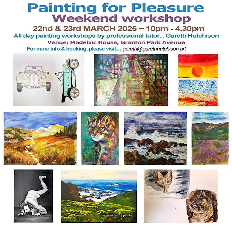 Resident studio artist - Gareth Hutchison will help you every step of the way from beginning to compilation of your own art work(s) over the course of an entire weekend and/or over the course your chosen day. You can choose to use Acrylics, watercolours, oil painting, drawing or mixed media and collage.