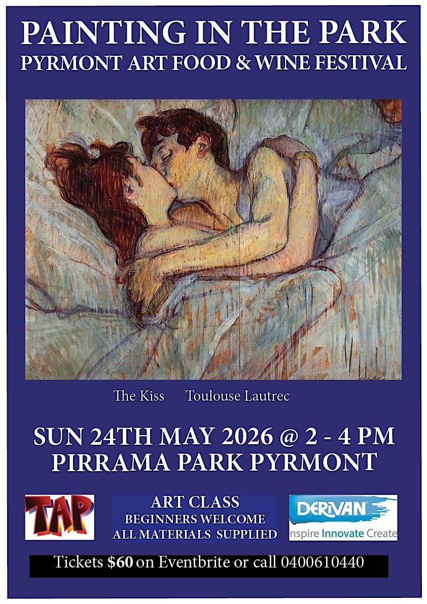 Come to a guided class painting The Kiss down at the glorious Sydney harbour forshore at the fabulous Pyrmont Food & Wine Festival. all materials are provided and you can take your masterpiece home. This is a highly recommended activity and a joyous day.