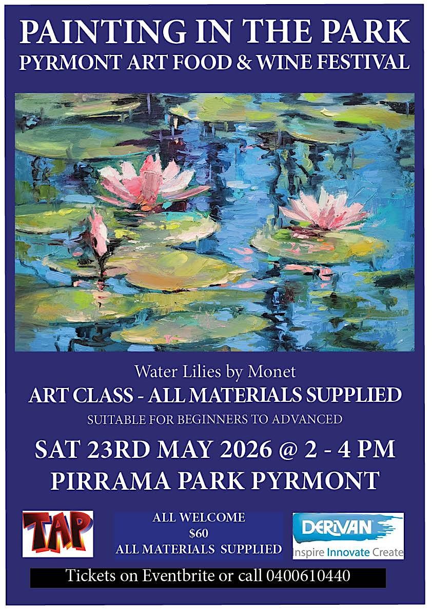 Come to a guided class painting Monet's Water Lilies down at the glorious Sydney harbour forshore at the fabulous Pyrmont Food & Wine Festival. all materials are provided and you can take your masterpiece home. This is a highly recommended activity and a joyous day.