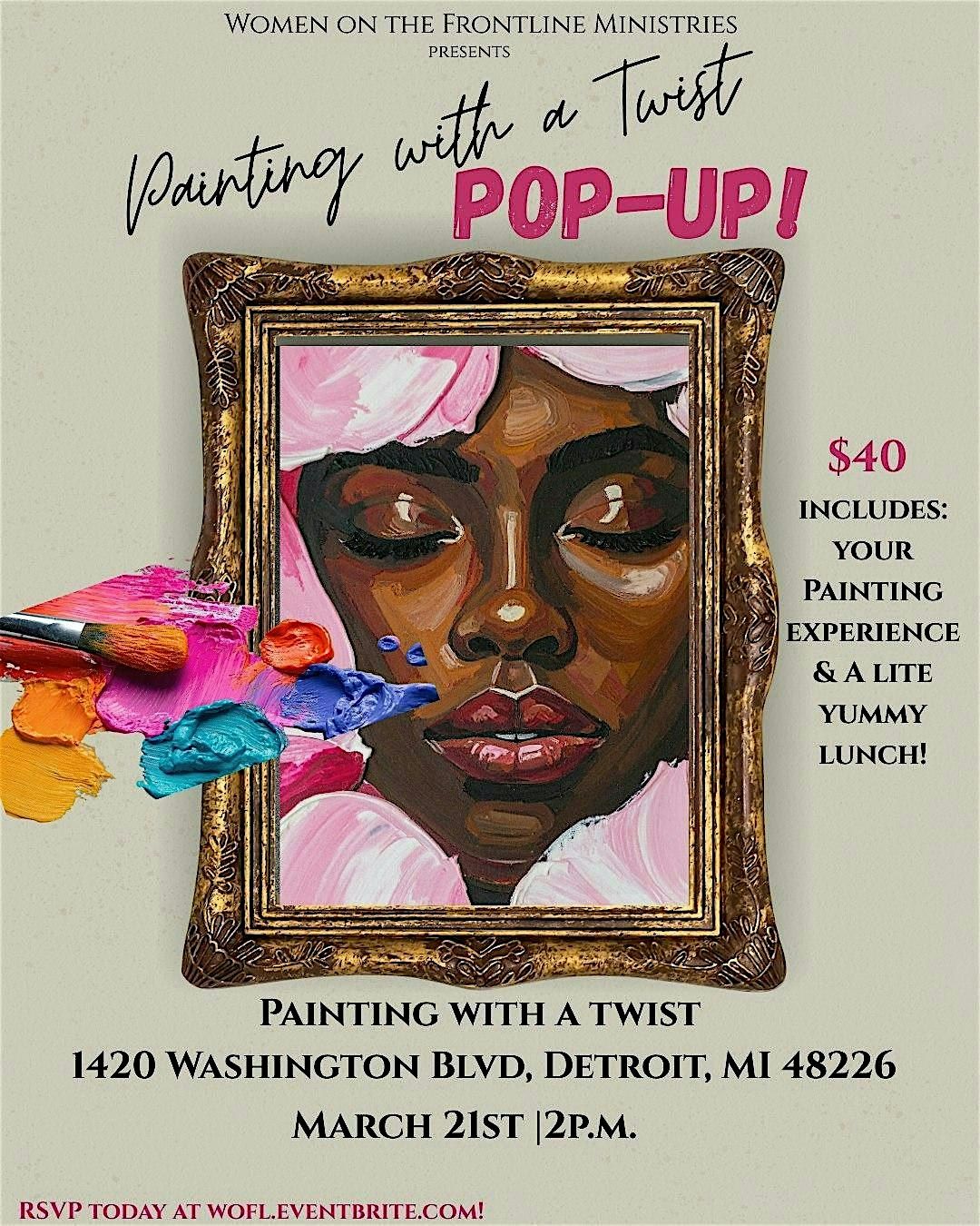 Get ready for a super fun in-person painting experience like no other with your sisters! Whether you're a newbie or a pro, this POP-UP event is all about relaxing, bonding, creating, and having a blast celebrating Women's History Month. Bring your sister to enjoy this fun and inspiring time out. Our scripture for this Women's History Month is Proverbs 31: 30 KJV "Favour is deceitful, and beauty is vain: but a woman that feareth the Lord, she shall be praised." We understand it's more than our outer appearance which is fleeting, it's about our right standing with Jesus.