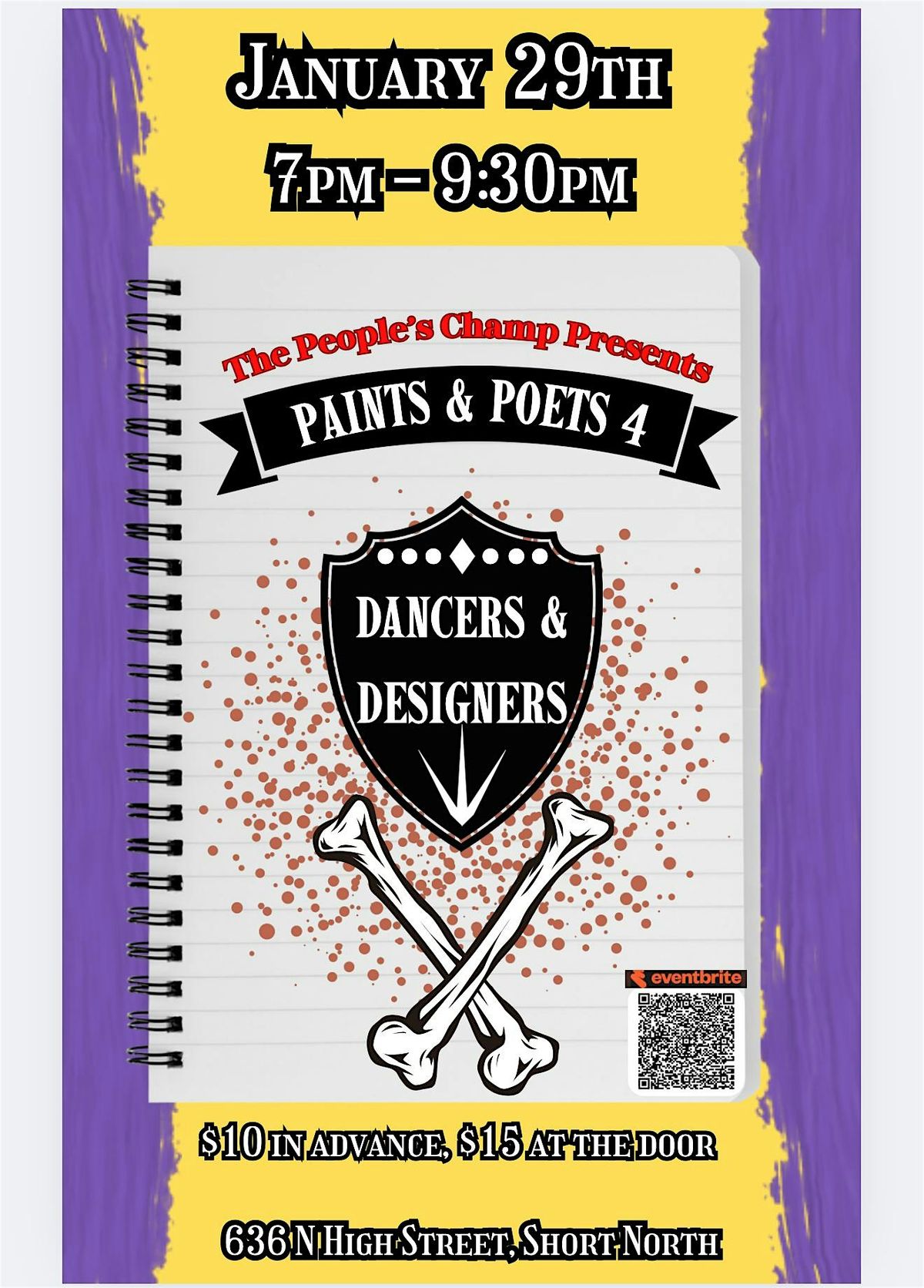 Paints & Poets 4: Dancers & Designers is a celebration of creativity, culture, and community. Join us on January 29th from 7:00–9:30 PM .