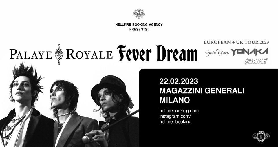 A pochi mesi dal nuovo album, Hellfire Booking Agency annuncia i Palaye Royale!Forti di date sold out in tutto il mondo, una discografia a prova di bomba e premi di rilevanza internazionale, niente sembra poter fermare i Palaye Royale. E di ripicca, l’astro nascente degli Stati Uniti si spinge ancora oltre. Con un nuovo album previsto per il 28 ottobre, i Palaye Royale si avvalgono nientemeno che del producer Chris Greatti, candidato al Grammy e storico collaboratore di Yungblud e Willow, attirando su di sé riflettori da ogni angolo del pianeta. Alt rock, art pop, pop punk, emo: i generi attribuiti ai Palaye Royale sono infiniti, ma una cosa è certa. Con i loro testi viscerali e nudi, le loro melodie incalzanti e trascinanti e i loro messaggi di speranza e vulnerabilità, i Palaye Royale sono la voce della nuova generazione. E non vediamo l’ora di rivederli all’opera.
