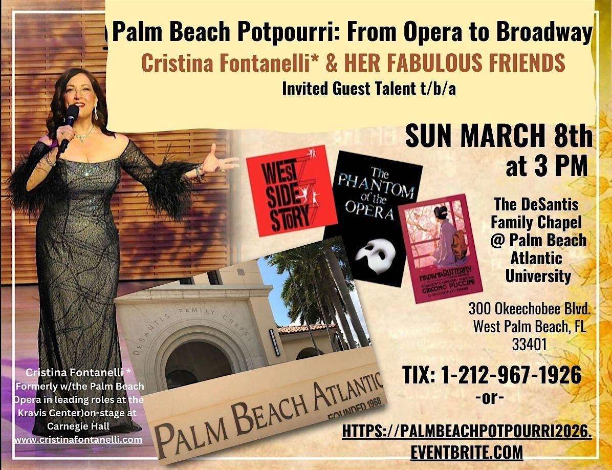 Join us for an unforgettable afternoon of the world's most-loved Broadway tunes and opera favorites at the DeSantis Family Chapel. On Sunday, March 8, 2026, at 3:00 PM (Eastern Daylight Time). Starring and hosted by the talented and renowned singer/PBS-TV host for Andrea Bocelli and star of title roles at the Palm Beach Opera, Cristina Fontanelli Cristina Fontanelli – Opera, Classical-crossover and Award-winning Singer / PBS-TV Host / Producer, will take the stage along with local young talent, to transport you from the world of opera to the enchanting realm of Broadway.