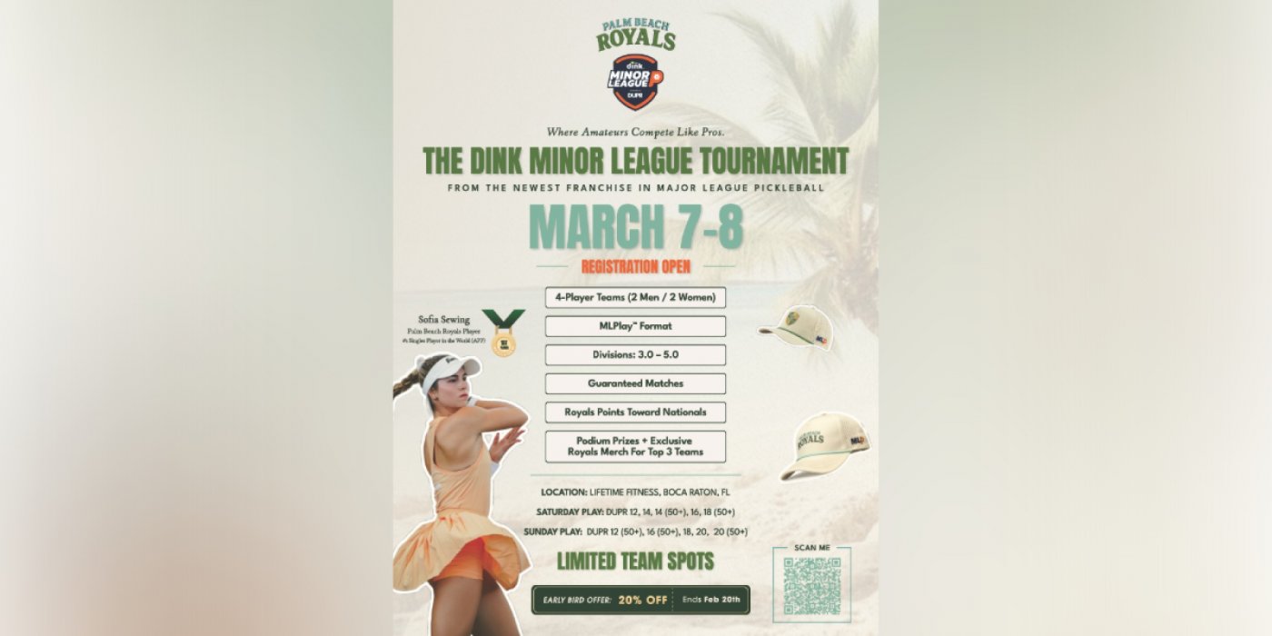 WHAT: The Palm Beach Royals, one of South Florida’s premier-level Major League Pickleball (MLP) teams, will host a Dink Minor League Pickleball Tournament, a team-based competition utilizing the official MLPlay™ format and offering amateur players the opportunity to compete, earn Royals points, and advance toward Nationals. Spectators are welcome to attend at no cost. Top-ranked professional pickleball player and the first Palm Beach Royals player in franchise history, Sofia Sewing, will be in attendance during the tournament. The tournament features four-player teams consisting of two men and two women competing in a structured, team-based format. Divisions range from 3.0 to 5.0 skill levels, providing competitive opportunities for intermediate through advanced players. All teams are guaranteed matches throughout the tournament. Players will earn Palm Beach Royals points toward qualification for the Royals Nationals-level competition team; The MiLP National Championship is the highest level of amateur competition in pickleball. The top three teams in every division will receive podium prizes including exclusive Palm Beach Royals merchandise which will be awarded to the top three finishing teams in each division.