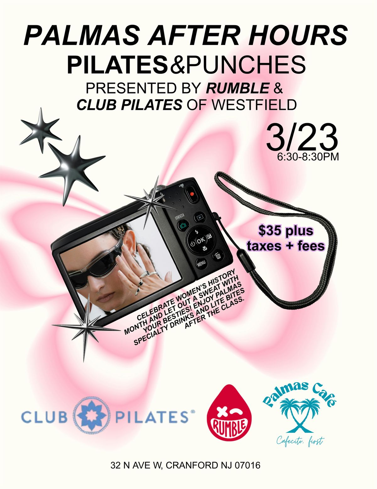 Join us at Palmas Cafe on March 23, 2026 at 6:30 PM (ET) for a fun evening with Rumble and Club Pilates Westfield! Get ready to mix some Pilates moves with energizing punches in a relaxed, social vibe. Whether you're a beginner or a pro, this is the perfect way to unwind and connect with others. Don't miss out on this unique after-hours workout experience. We will be highlighting Women's History Month with an upbeat playlist for the girls! Please remember to bring your own mat for the class.