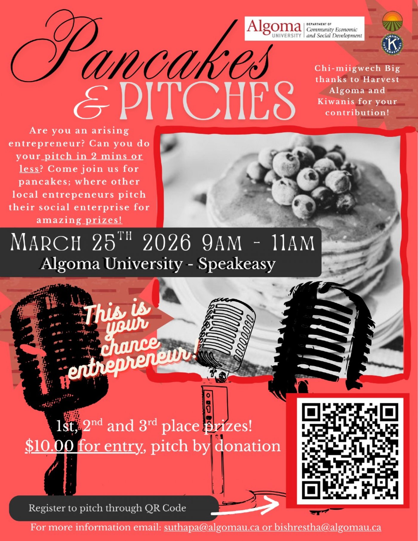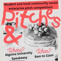 We are excited to invite you to participate in Pancake and Pitches, an engaging social enterprise pitching event taking place on March 25, 2026 at 9:00 AM at the Speakeasy at , Algoma University (1520 Queen St E, Sault Ste. Marie, ON).