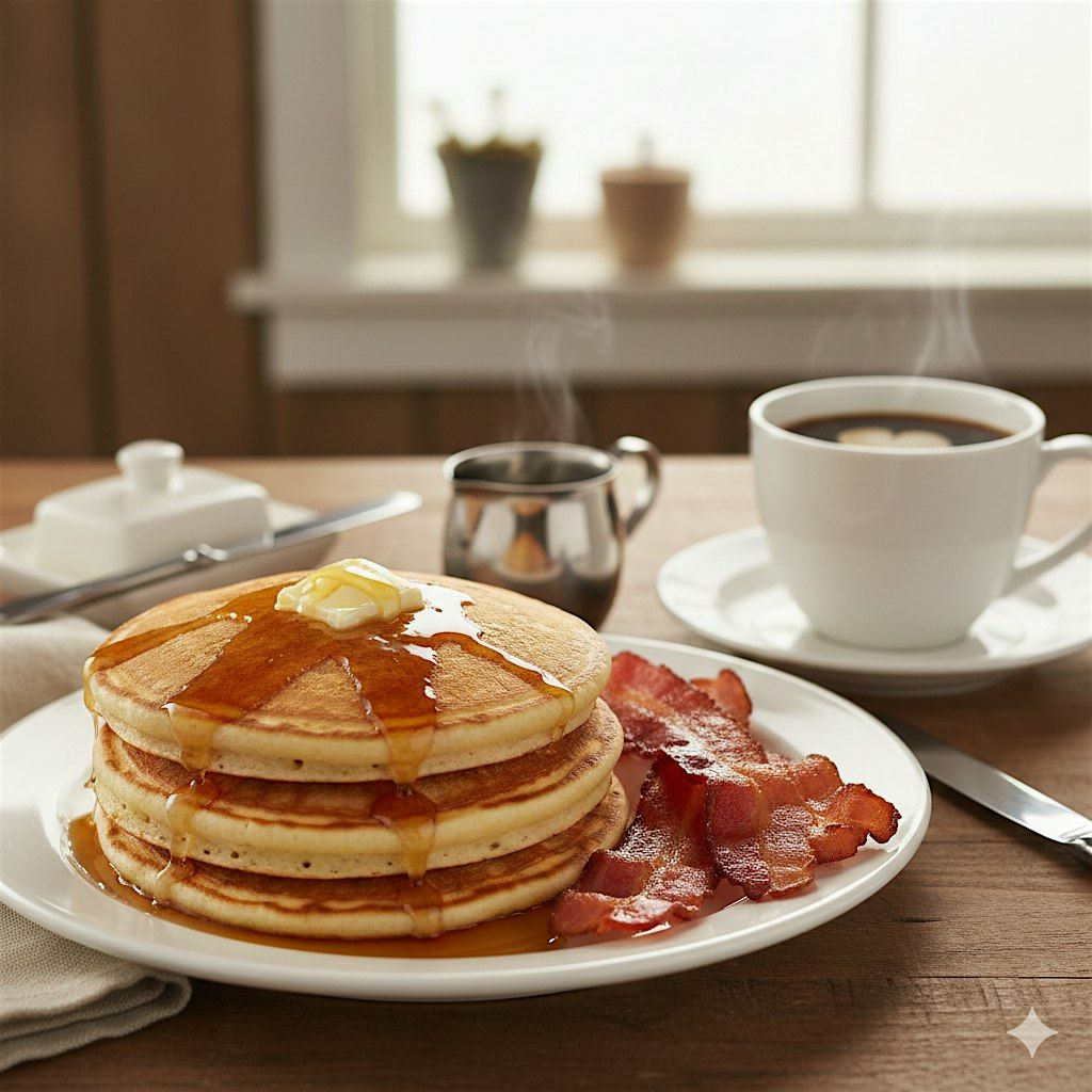 Why cook? Enjoy pancakes and bacon with us! Dine in or take out is available.Free to all, good will donations accepted