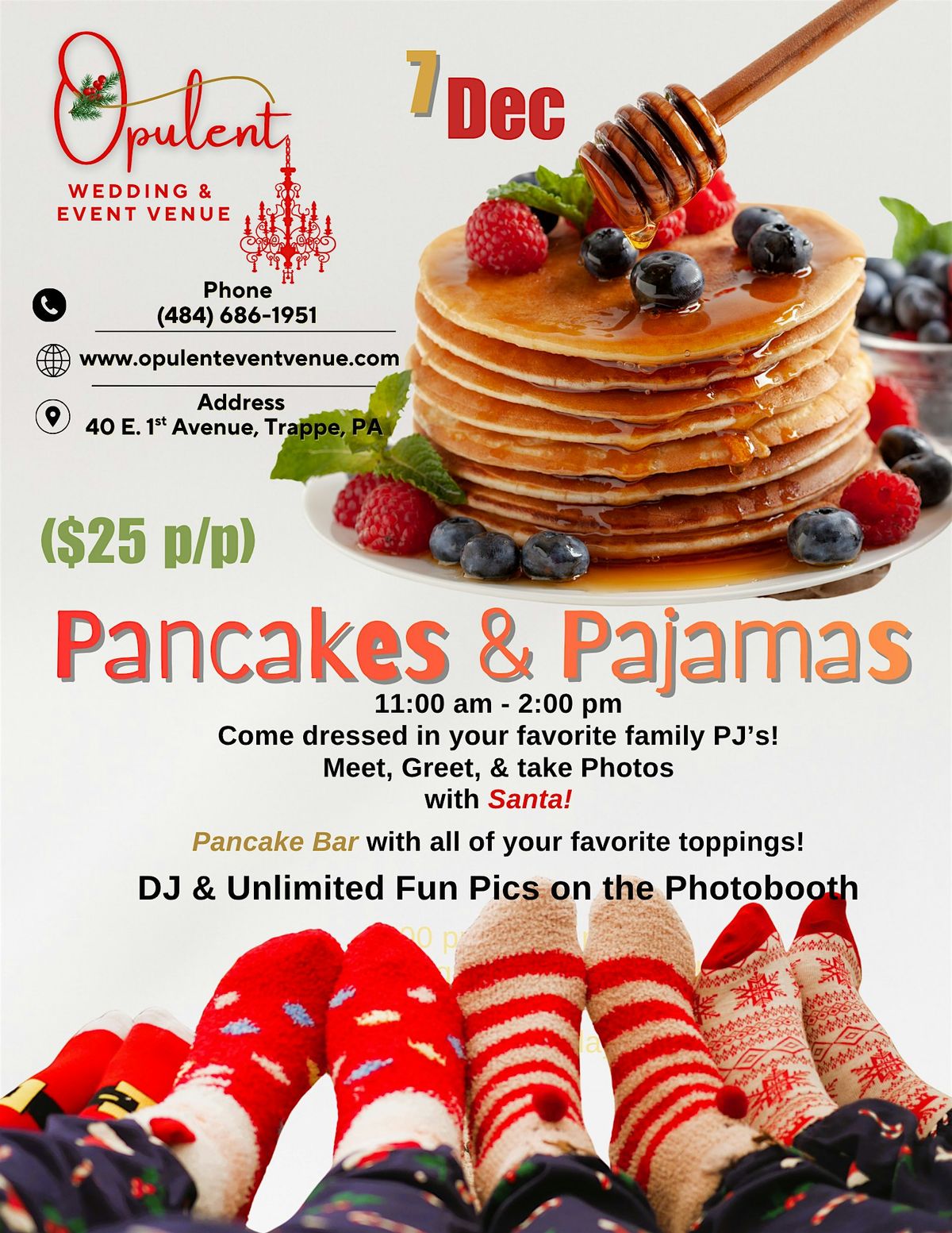 Come in your PJ’s and enjoy delicious pancakes with unlimited toppings and a photo with Santa! Sing a long with your favorite holiday song!