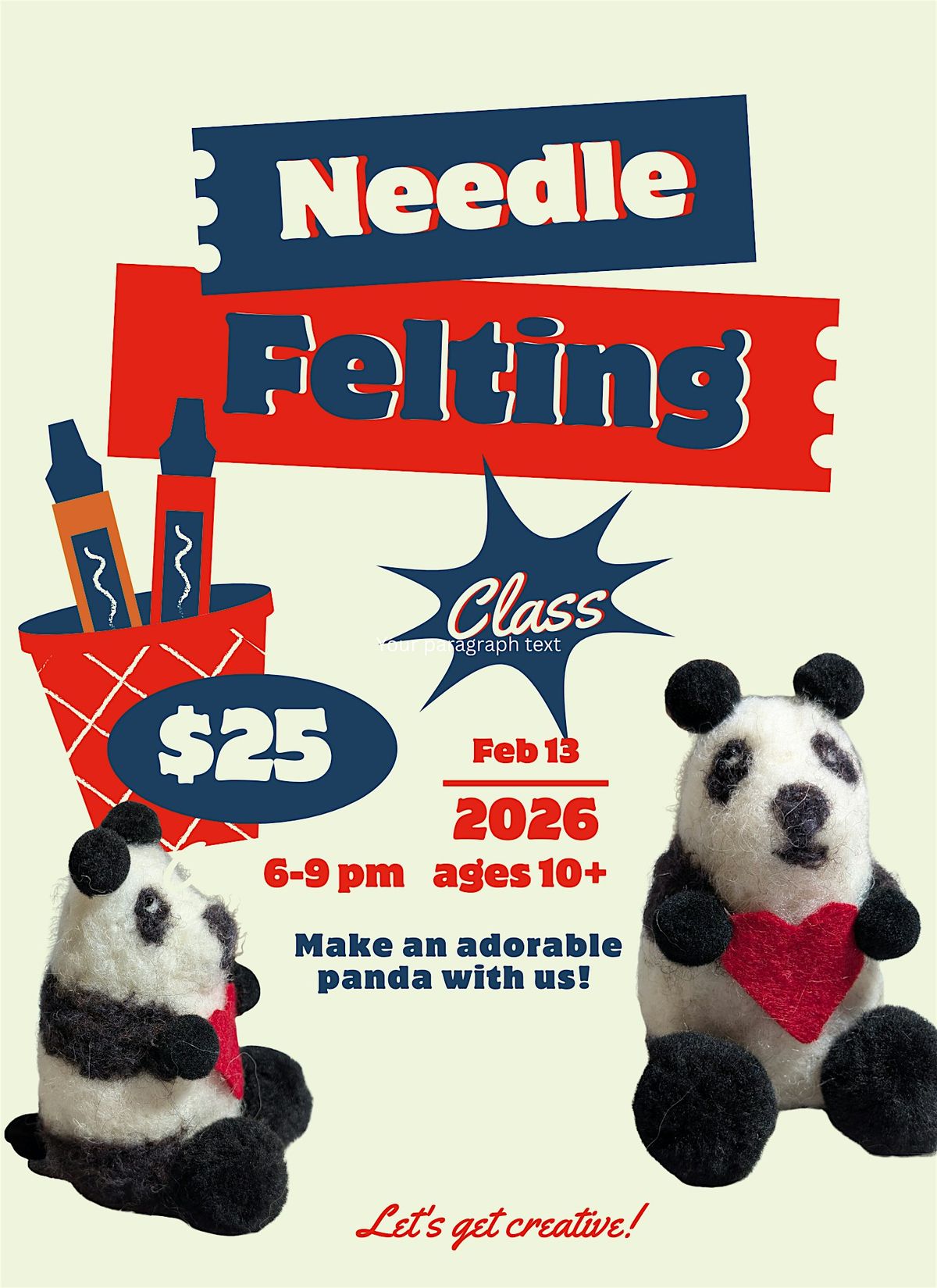 Join us for a fun and cozy in-person workshop where you'll learn the art of needle felting to create your very own adorable panda! Whether you're a beginner or just love crafts, this hands-on session is perfect for you. Bring your creativity and enjoy a relaxed atmosphere with fellow craft lovers. No experience needed—just enthusiasm and a smile!