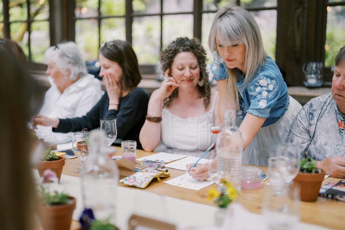From there, we’ll transition into a guided watercolor workshop with artist and author Sarah Simon, also known as The Mint Gardener. With her gentle, approachable style, Sarah will introduce the foundations of watercolor painting through flowing washes and simple techniques. You’ll then apply what you’ve learned to paint pansies on a pre-drawn template—no drawing experience required.