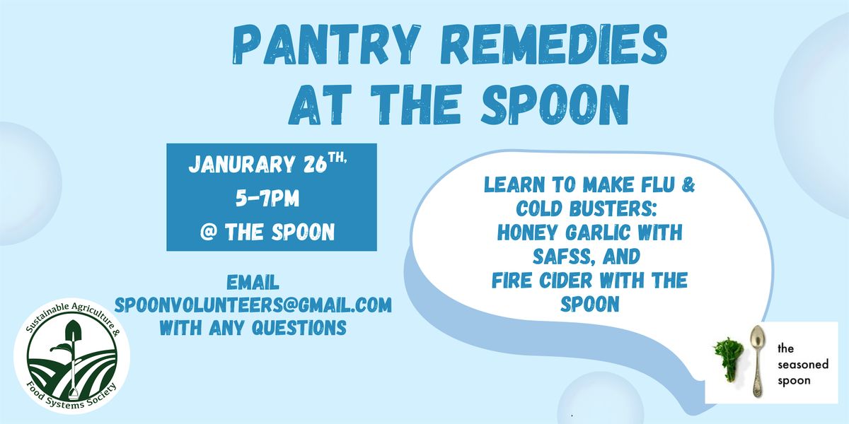 On Monday, Jan. 26th the Spoon and Sustainable Agriculture Food Systems Society (SAFSS) will be hosting a hands-on workshop creating two remedies that help fight cold and flus, with ingredients that can be found in your pantry. We will be learning about these recipes, creating them together, and participants can take a sample home with them, along with the knowledge to keep making them at home.