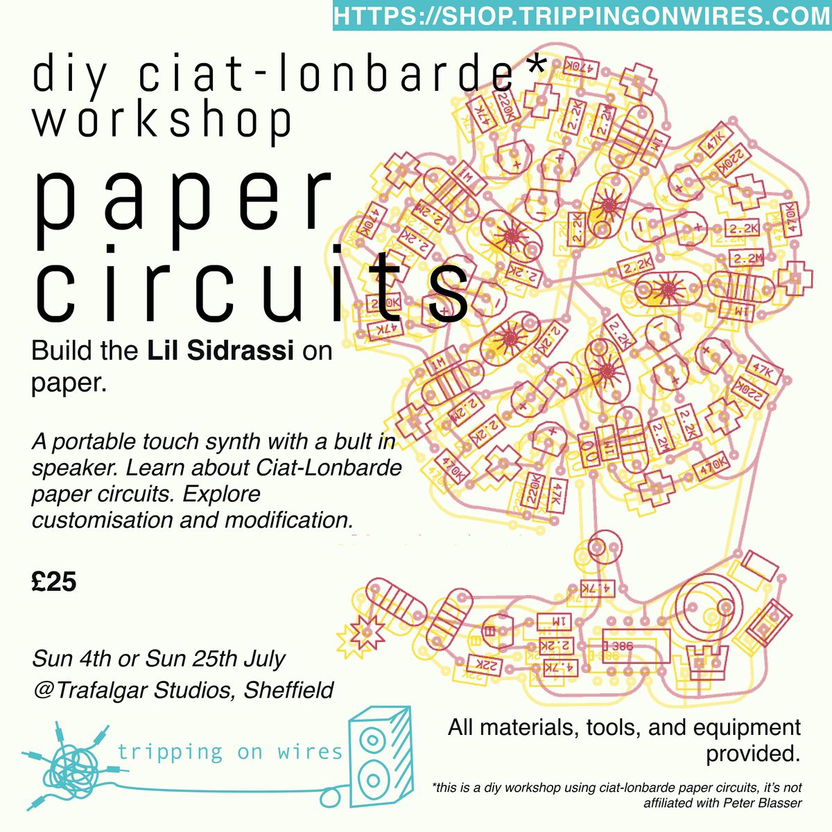 The workshop price is £25 (including all materials). For tickets please visit - https://shop.trippingonwires.com/merch/paper-circuits-workshop-diy-ciat-lonbarde-lil-sidrassi