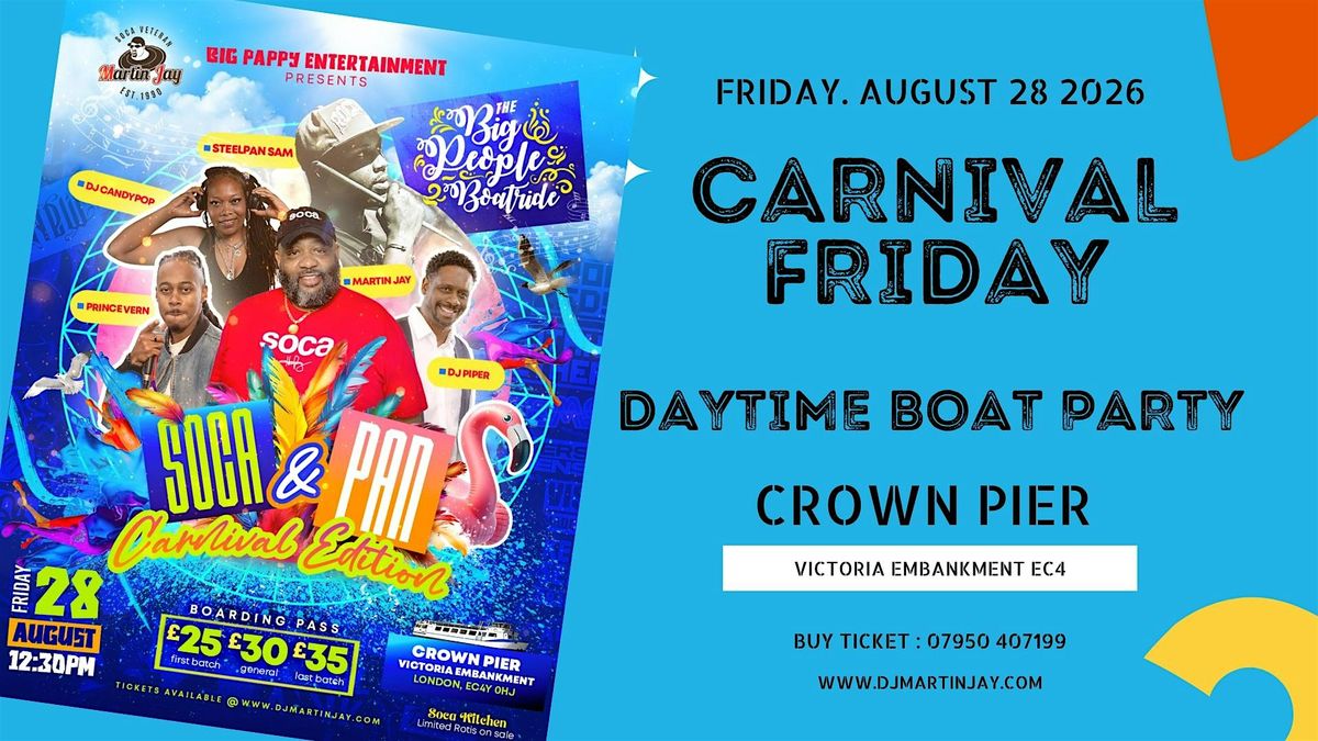 This is always a great vibe. The Big People Boatride on Carnival Friday with soca veteran Martin Jay and Friends. Get into that Carnival mood as we cruise along the River Thames to the sweet sound of Soca and Steelpan.