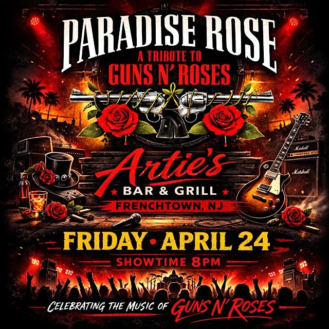 Join us in person for an unforgettable night with PARADISE ROSE - GUNS AND ROSES TRIBUTE. If you're a fan of those legendary rock anthems and killer vibes, this tribute band will blow your mind. Expect all the classic hits, high energy, and that authentic GNR spirit you love. Don't miss out on a rocking night of music and good times!