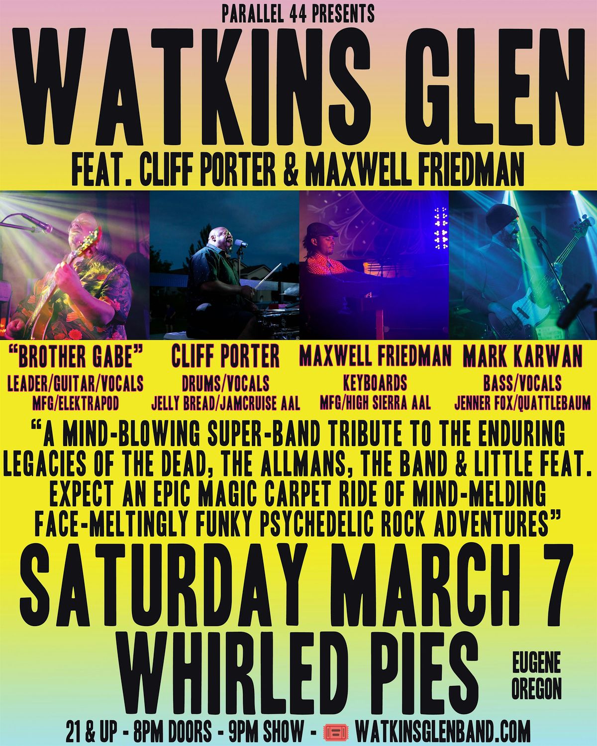 WATKINS GLEN returns to Whirled Pies on Saturday, March 7th with their dazzling mashup tribute to the Grateful Dead, the Allman Brothers Band, The Band and Little Feat. For this tour, leader “Brother Gabe” Johnson has assembled a special super-group of truly world-class players – Drummer & singer Cliff Porter (Jamcruise AAL, Jelly Bread, Joe Marcinek Band), Hammond-endorsed organist Maxwell Friedman (MFG, High Sierra AAL) and bassist Mark Karwan (Jenner Fox, Quattlebaum) to deliver an extremely danceable and deeply soulful show for you. Don’t miss this amazingly magical night of spirit and song. Doors open at 8pm. 2 sets between 9pm and 11:30pm.