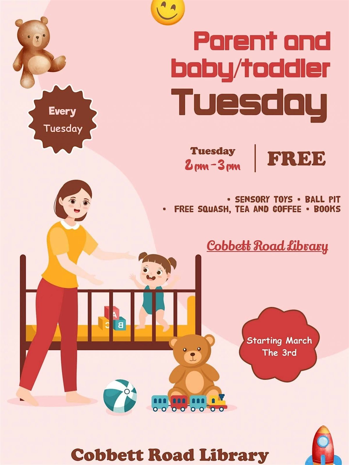 a new weekly hour for parents and babies/toddlers to come and use the library with free tea for mum or dad and coffee and juice for the little ones. We have a small selection of sensory toys and a small ball pit. During this hour, you can make noise, read out loud and play with toys.
