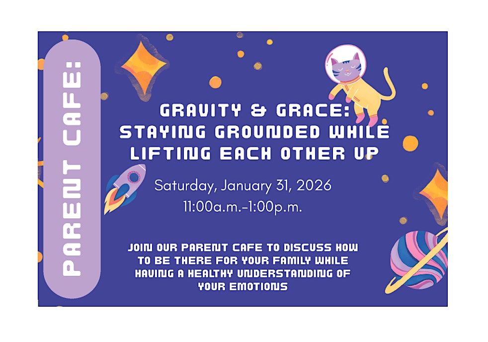 We’re excited to invite you to our upcoming Parent Café: Gravity and Grace, Staying Grounded While Lifting Each Other Up. This cafe is designed to discuss how to be there for your family while having a healthy understanding of your emotions. Participants will explore how to create a safe space for their children and themselves.