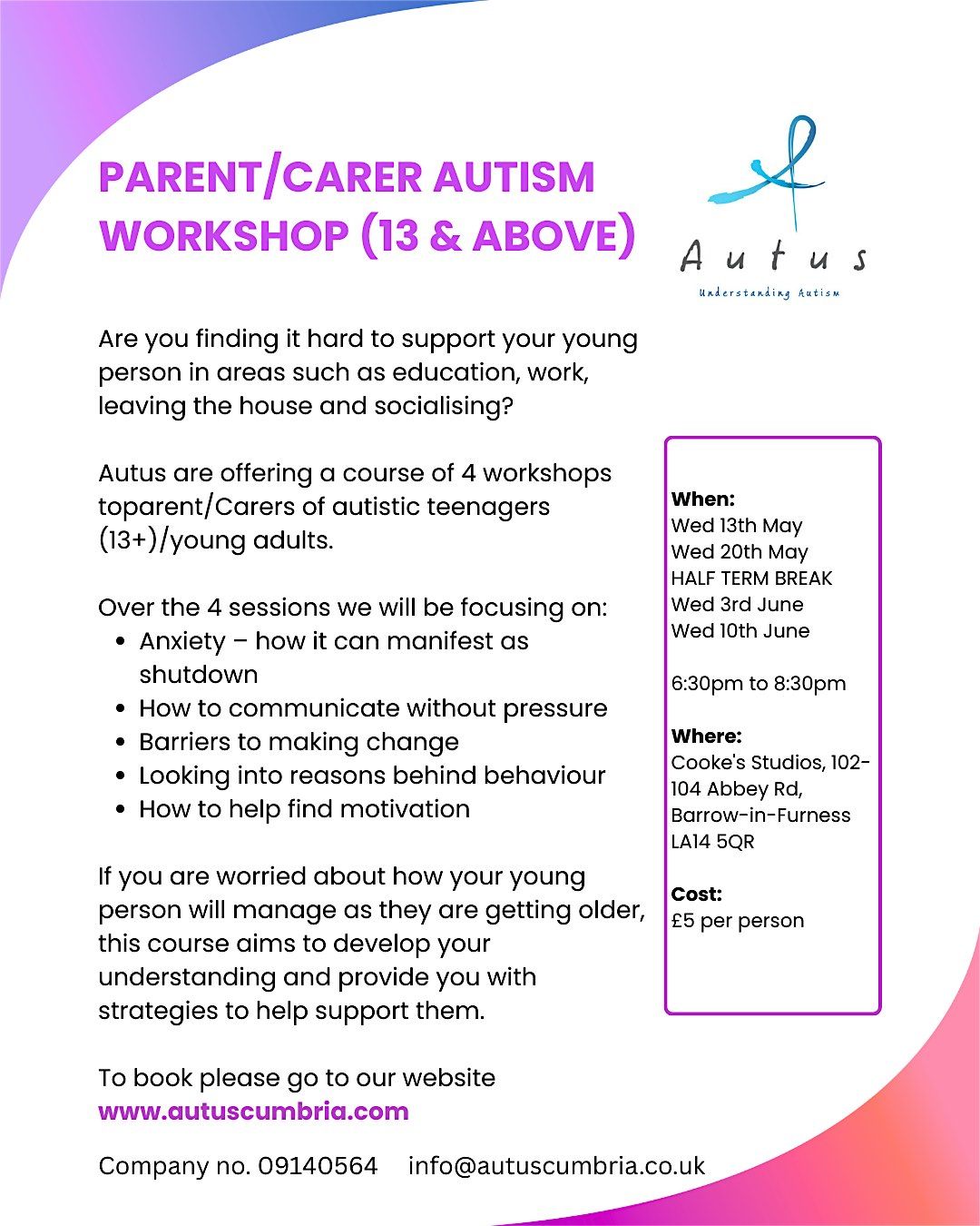 Autus are offering a course of 4 workshops toparent/Carers of autistic teenagers (13+)/young adults.